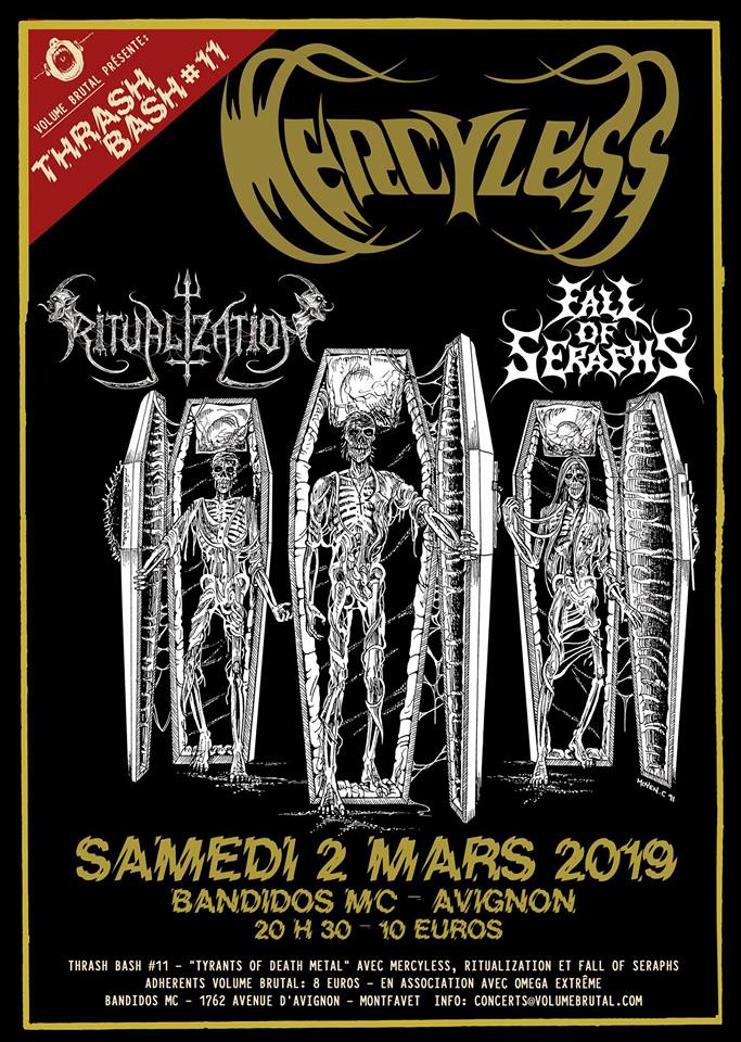 Pour la 11e édition du Thrash Bash, l'association Volume Brutal organise un événement qui devrait ravir le public du quart Sud-Est de la France. En effet, le samedi 2 mars, dès 20h30 se produiront les légendaires death thrasheurs MERCYLESS au Bandidos MC d'Avignon. Et pour encore un peu plus de finesse et de poésie, ils seront accompagnés des petits nouveaux mais efficaces FALL OF SERAPHS puis RITUALIZATION et leur death aux relents black metal en première partie de soirée.