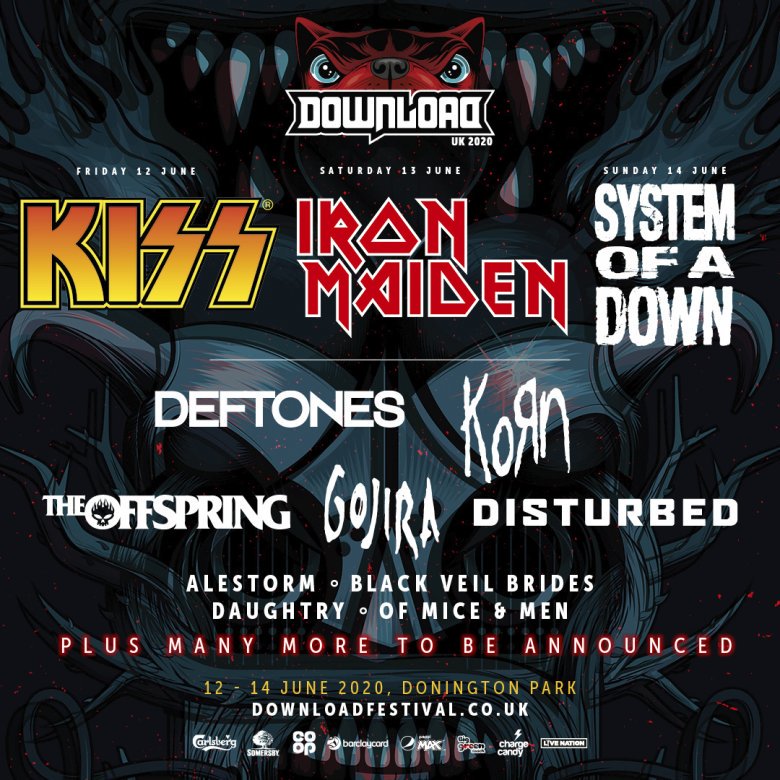 Les trois têtes d’affiche ainsi que neuf autres groupes viennent d’être annoncées pour ce qui forme le début de la programmation de l’édition anglaise du Download Festival qui se déroulera sur trois jours du 12 au 14 juin 2020. Ainsi, la "tête de proue" verra KISS, IRON MAIDEN et SYSTEM OF A DOWN se répartir chacun une soirée et ils seront accompagnés de DEFTONES, KORN, GOJIRA, THE OFFSPRING, DISTURBED, OF MICE AND MEN, ALESTORM, BLACK VEIL BRIDES et DAUGHTRY. Voilà ce que l’on connait à ce jour.