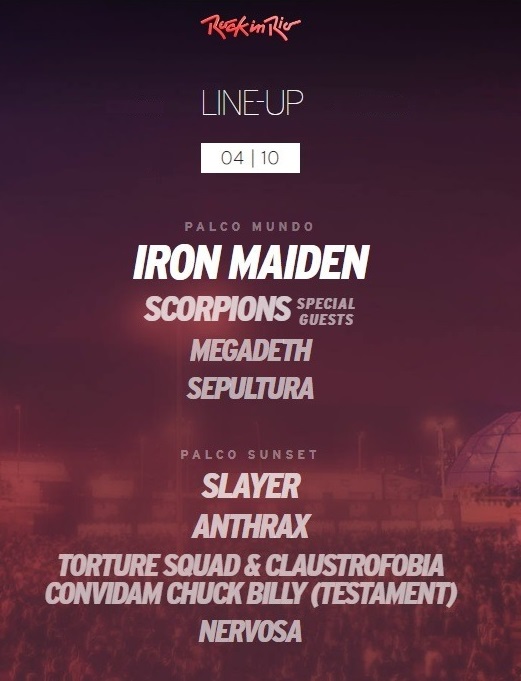« Stream for me Rio! », un jeu de mots facile, nous en convenons, mais parfaitement adapté à cette information. Le concert que donnera IRON MAIDEN ce jour, vendredi 4 octobre, dans le cadre de sa tournée "Legacy Of The Beast Tour" lors du festival Rock In Rio en compagnie des locaux SEPULTURA, d'ANTHRAX, SLAYER, MEGADETH, des Allemands HELLOWEEN et SCORPIONS, des jeunes et talentueuses thrasheuses brésiliennes NERVOSA, TORTURE SQUAD & CLAUSTROPHOBIA (avec Chuck Billy de TESTAMENT comme invité) est retransmis en direct sur le site LiveXLive. Ramené à notre heure locale, la diffusion aura lieu à 2h30 dans la nuit de samedi.
