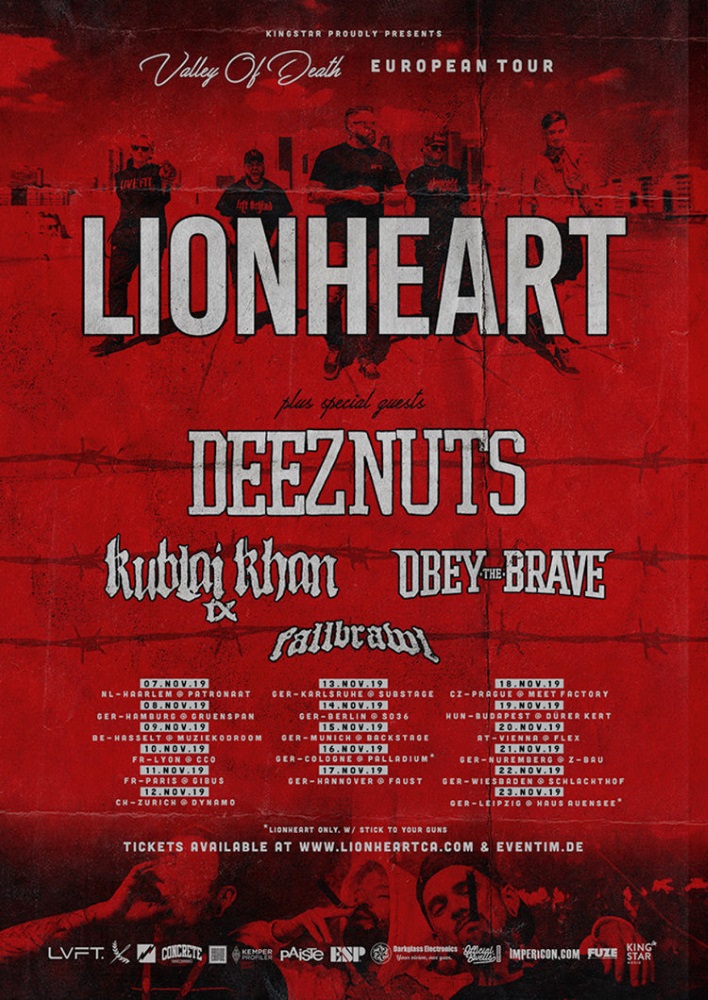 Après deux ans de tournée incessante à travers le monde, LIONHEART est de retour avec « Valley Of Death » qui sortira sur le label Arising Empire le 15 novembre prochain, date à laquelle le groupe aura débuté une tournée à travers l'Europe avec DEEZ NUTS, KUBLAI KAHN, OBEY THE BRAVE et FALLBRAWL, qui passera par la France le 10 novembre à Lyon au CCO et le 11 novembre à Paris, Le Gibus Live.