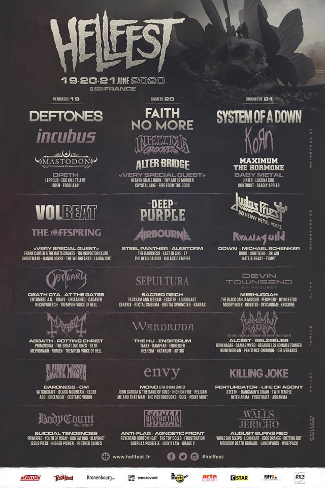 de DEFTONES, FAITH NO MORE, SYSTEM OF A DOWN, KORN, OPETH, ALTER BRIDGE à JUDAS PRIEST, VOLBEAT, DEEP PURPLE, THE OFFSPRING, AIRBOURNE, RUNNING WILD en passant par SEPULTURA, OBITUARY, Devin Townsend, MESHUGGAH, SACRED REICH, BODY COUNT, MAYHEM ou WALLS OF JERICHO, SOCIAL DISTORSION et KILLING JOKE, nous vous laissons découvrir le line-up 2020.