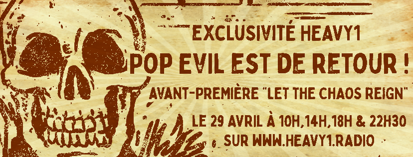 Retrouvez "Let The Chaos Reign" en avant-première le mercredi 29 avril sur radio HEAVY1 à 10h, 14h, 18h et 22h30 et profitez du gros son de ce nouveau single. Plus de détail sur le prochain POP EVIL très bientôt sur le site HARD FORCE.