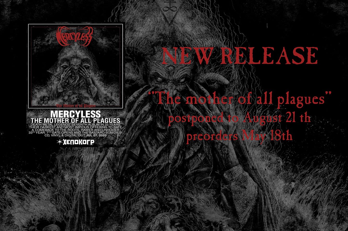 MERCYLESS sortira finalement son septième album initialement prévu le 7 juillet et intitulé « The Mother of All Plagues », le 21 août. En attendant, vous pouvez découvrir un premier extrait, "Banished from Heaven", disponible sur le sampler du label Xenokorp disponible ici.
