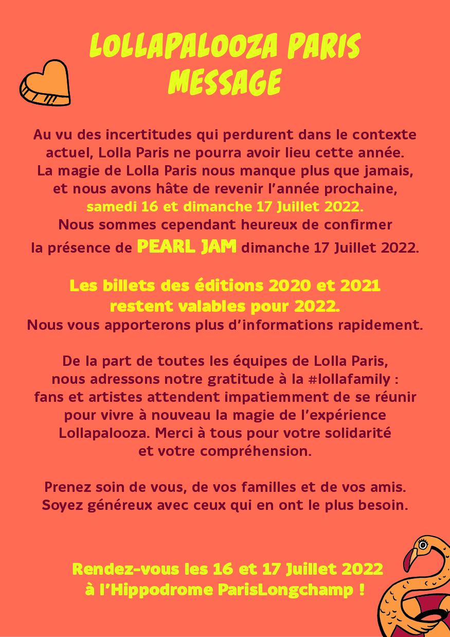 Un an après avoir reporté la tournée 2020, il est difficile de se résoudre à reporter à nouveau le retour sur la route. Le groupe PEAR JAM est encouragé par les efforts de vaccination qui ont lieu dans le monde entier et attend avec impatience le jour où il pourra à nouveau partir en tournée en toute sécurité. En attendant, les musiciens espèrent que tout le monde restera vigilant et continuera à porter son masque dans l'attente de se réunir en 2022.