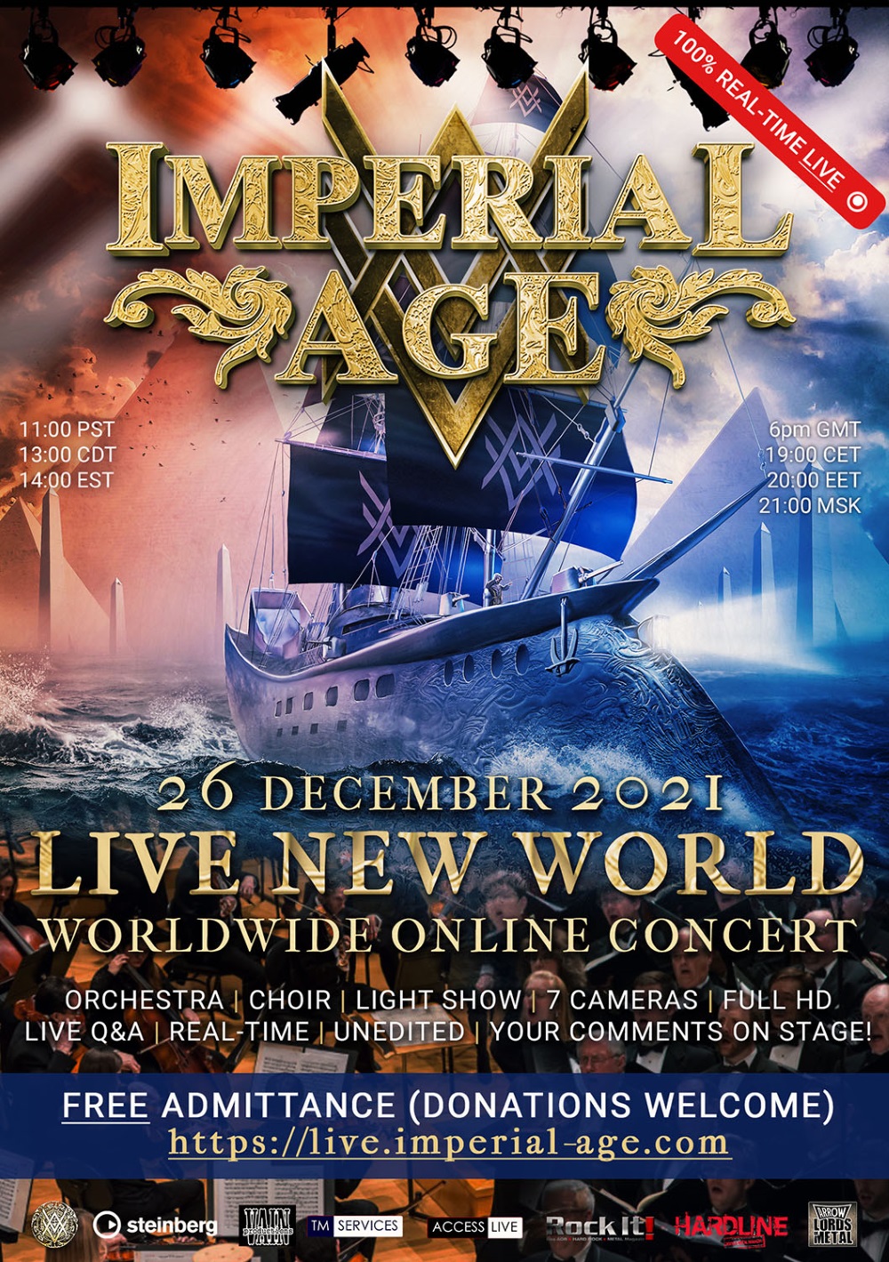 Inspiré par le succès inattendu du "Live On Earth: The Online Lockdown Concert" (qui a été l'un des premiers concerts de metal de ce type, en ligne donc, le 25 avril 2020, qui a permis au groupe de réunir 38 000 spectateurs de tous les continents, 11 500 $ de dons et de multiples offres de contrats discographiques), IMPERIAL AGE fait cette fois-ci encore plus fort : une plus grande salle (5 fois plus grande que "Live On Earth") un orchestre de chambre & des choristes, 7 cameras filmant en résolution 4K, un formidable light-show, de nouveaux costumes, une séance de questions/réponses en direct entre les chansons - et bien sûr tous les titres de leur nouvel album « New World ».