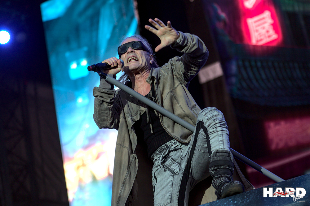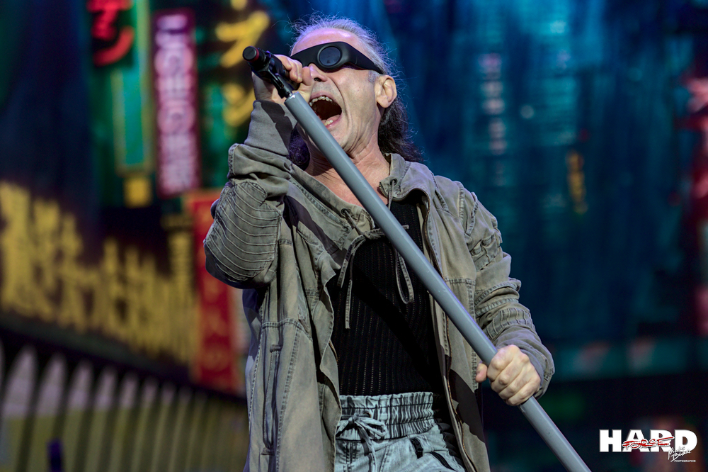 C’est enfin l’heure grâce au fameux ''Doctor Doctor'', le public réagit aussitôt et ça fait plaisir d’entendre ça après un Hellfest plutôt silencieux. Les écrans géants changent de configuration et passent de portrait à paysage, exigence de MAIDEN oblige. Les lumières passent du vert au bleu, et c’est parti pour l’intro ''Blade Runner'' extrait du film du même nom, laissant apparaître le nouveau light-show en forme de prisme et agrémenté de bandes LED. Dans le même temps, on découvre le nouveau décor futuriste en lien avec les visuels dévoilés pour cette tournée.