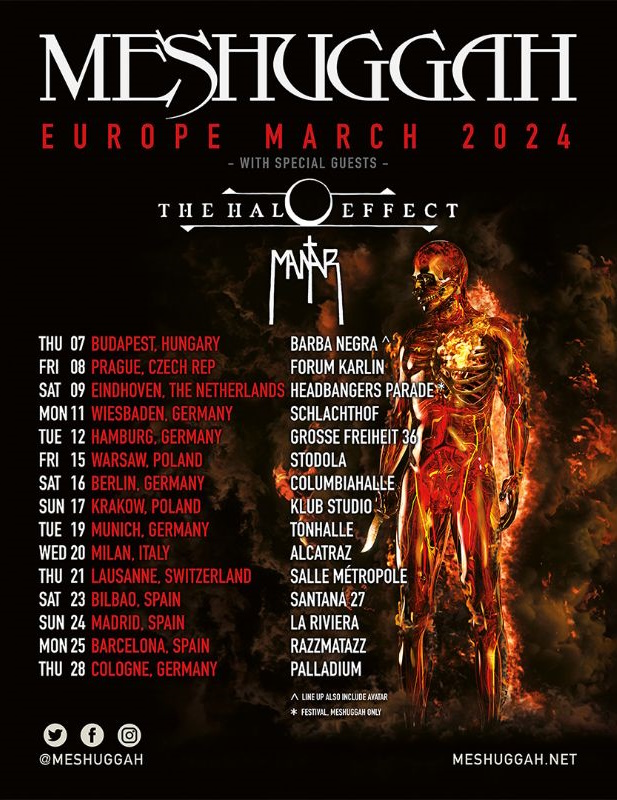 MESHUGGAH se prépare pour une nouvelle tournée européenne en tête d'affiche en mars 2024, mettant l'accent sur les pays continentaux qui ont été oubliés lors de la première étape du "Immutable Tour". Connu pour ses performances live révolutionnaires et sa production de concerts époustouflante, MESHUGGAH débutera le 7 mars à Budapest, en Hongrie, et se terminera le 28 mars à Cologne, en Allemagne. Au cours de cette tournée européenne, le groupe sera rejoint par THE HALO EFFECT et MANTAR.