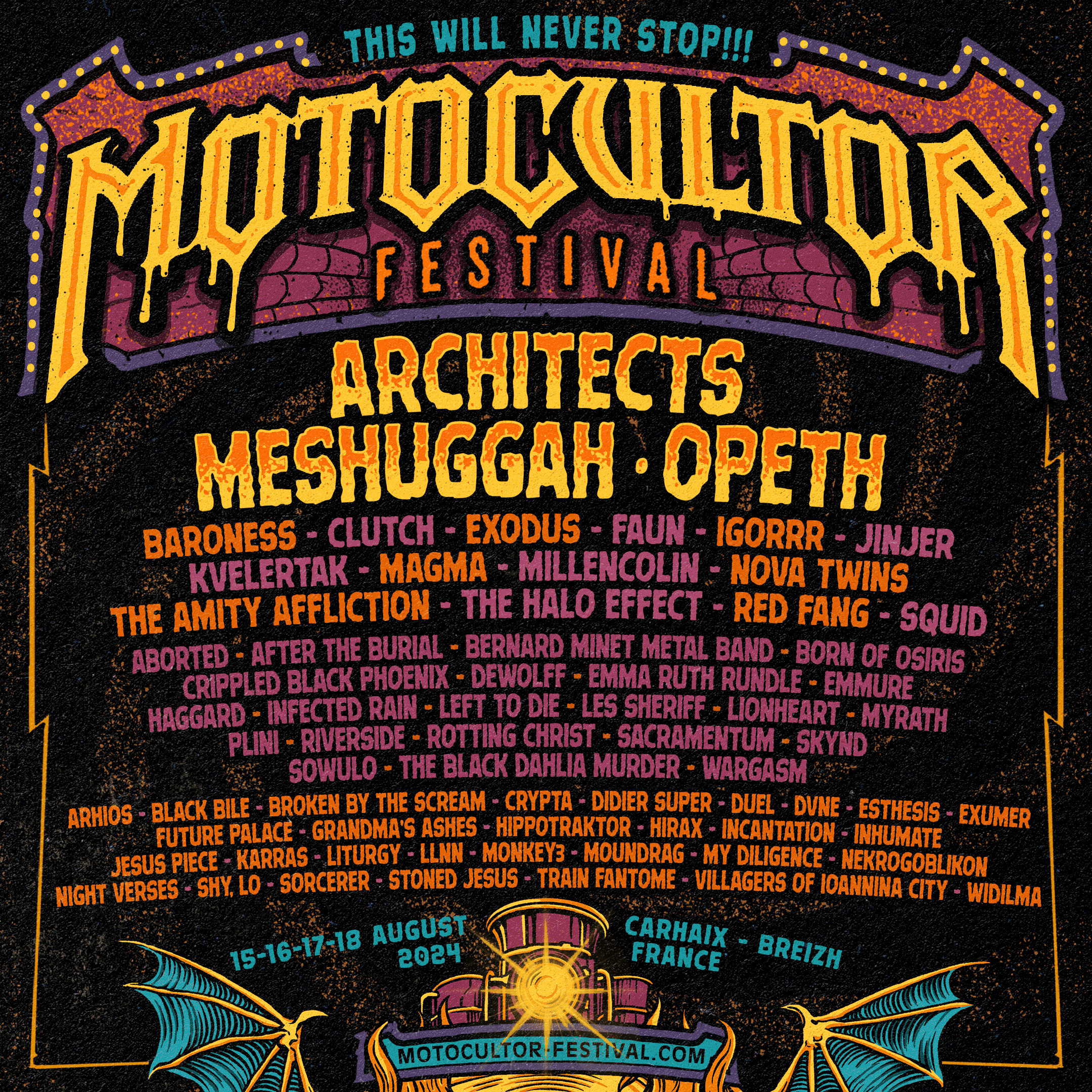 AFTER THE BURIAL / ARHIOS / BARONESS / BLACK BILE / BORN OF OSIRIS / CLUTCH / DUEL / DVNE / EXUMER / FUTURE PALACE / HIRAX / MESHUGGAH / MONKEY3 / MY DILIGENCE / NIGHT VERSES / PLINI / RED FANG / ROTTING CHRIST / STONED JESUS / THE BLACK DAHLIA MURDER / THE HALO EFFECT +9 groupes