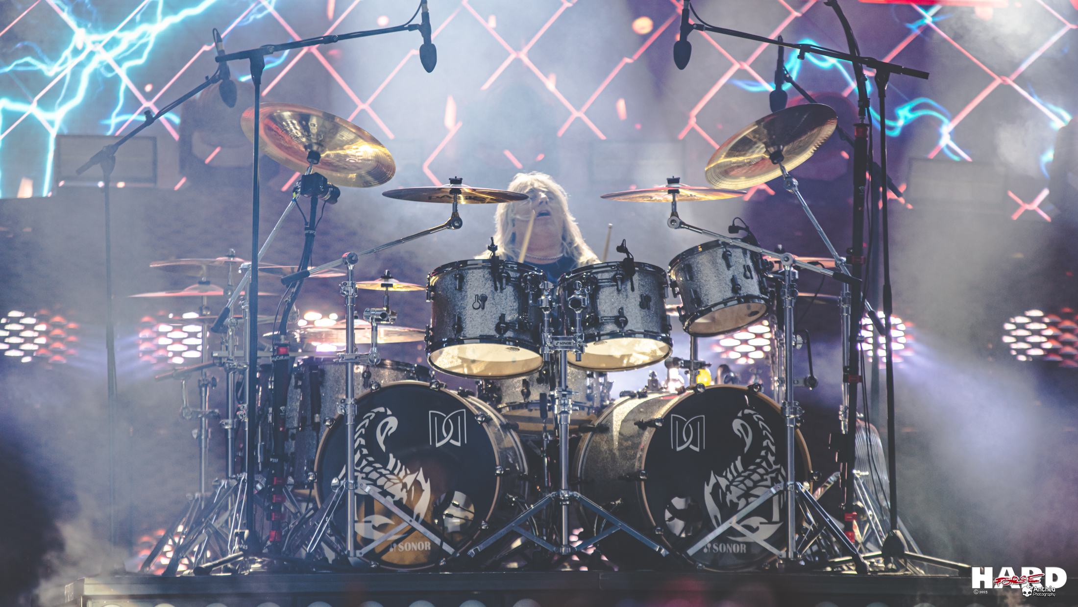 C'est l'école allemande : tout est précis et maîtrisé. Cela se ressent bien évidemment dans la production sonore. Le lieu y joue beaucoup évidemment, mais l'acoustique de ce soir est parfaite et donne à la batterie de Mickey Dee une puissance redoublée. L'ancien batteur de MOTÖRHEAD apporte une puissance incroyable au groupe. On n'en doutait pas. Le regretté James Kottak a trouvé un digne successeur, même son spectacle nous manque un peu. Mais SCORPIONS a fait le bon choix en recrutant Mickey Dee. Il n'y a qu'à constater la puissance monstrueuse du musicien durant son solo.