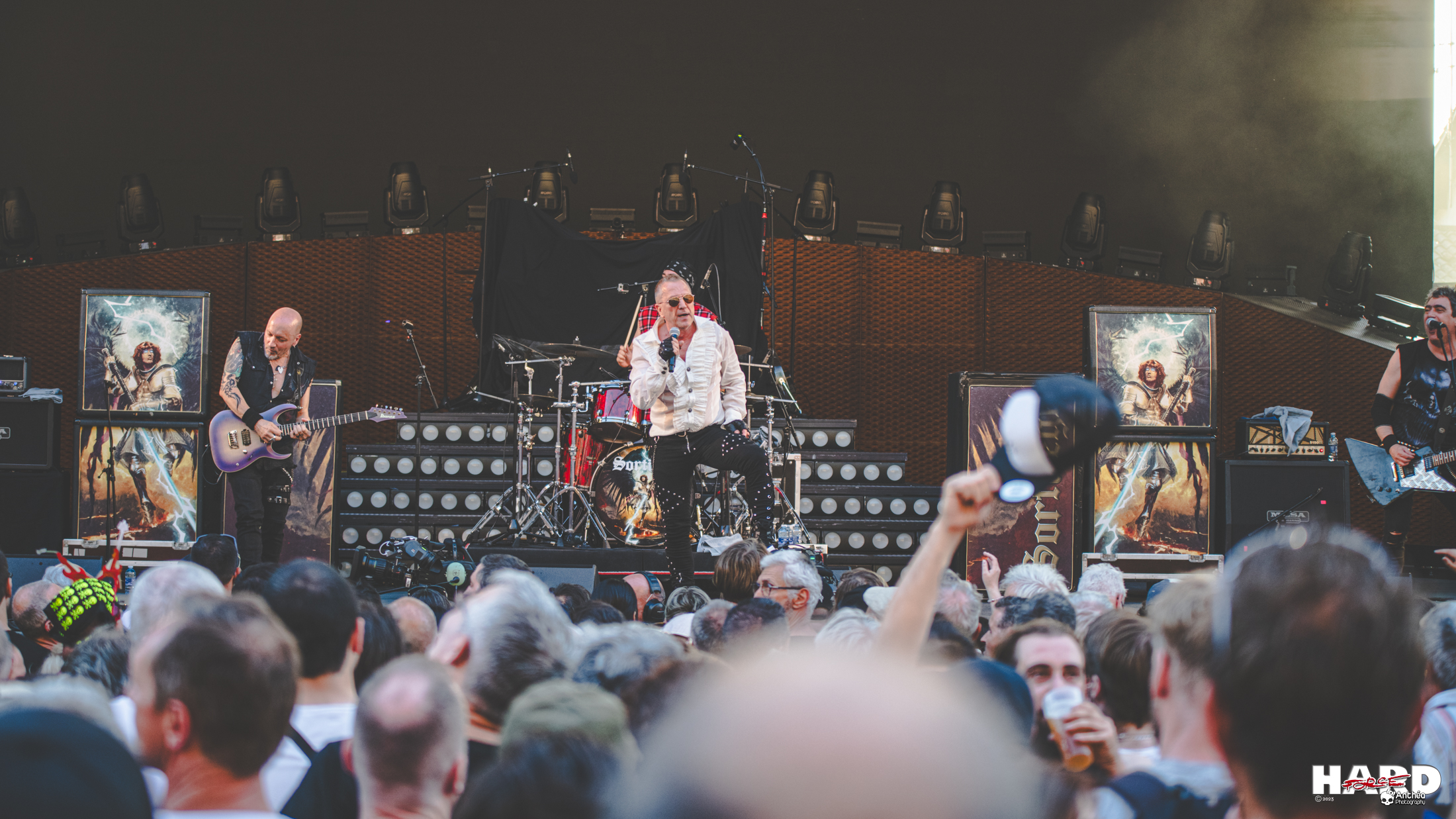 Pour bien lancer la soirée, il fallait un autre groupe légendaire. Ce sont les Français SORTILÈGE qui ont été désignés pour l'occasion. La formation s'est fait connaître en 1981 en produisant un heavy metal avec des textes dans la langue de Molière. Finalement, le groupe s'est séparé en 1986. Après une longue pause, il revient sur le devant de la scène en 2020 avec un nouveau line-up, autour de Christian ''Zouille'' Augustin au chant. Cela n'empêche pas le groupe de fonctionner avec précision, comme à l'époque, puisqu'il a sorti deux albums depuis sa reformation, « Phoenix » en 2021, « Apocalypso » et le live « Coram Populo » en 2023. SORTILÈGE livre ce soir, en guise de première partie de soirée, un best of de sa carrière en piochant dans ses albums. Le mélange fonctionne sans problème et conquiert les fans les plus anciens qui attendaient la prestation de pied ferme. Défi relevé et pari réussi pour la formation française qui la veille était au Zénith de Toulouse avec DEEP PURPLE.