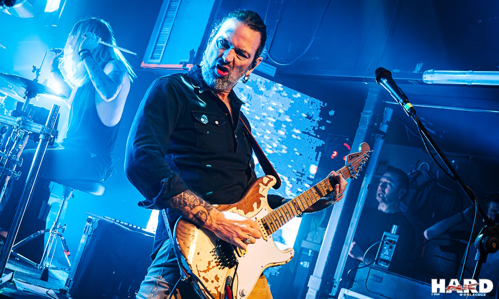 Venu d’Italie, KLOGR (NDJ: à prononcer Kay-Log-Ar) se charge de la suite avec un metal alternatif assez brut, à l’atmosphère un peu glauque qui n’est pas sans rappeler le grunge des années 90. Quant au son, on est en présence d’un style entre nu metal, hardcore et gros rock huileux. Avec quasiment le même décor scénique que les précédents, c’est-à-dire deux écrans de part et d’autre de la scène diffusant des images de clips vidéo, on a toutefois droit à une tout autre ambiance. A commencer par la rampe de fumigène placée juste devant la batterie, qui crache toutes les cinq minutes un épais brouillard de fumée (et par conséquent, masque le batteur pourtant talentueux avec son jeu très groovy), un jeu de lumières étudié fort bien fait, et pour le chanteur/guitariste, Rusty, un pied de micro pour le moins original, entouré de sisal et faisant penser immanquablement à un... arbre/griffoir à chat ! On s’attend presque à ce qu’un félin arrive en trombe sur scène pour s’acharner sur la chose en question (Et au passage, une petite pensée émue pour mon matou qui aurait sans doute apprécié que je lui ramène un souvenir du concert...) Cependant, musicalement, ça tient la route. La proposition est forte et le quatuor possède une vraie présence scénique et un charisme certain. On peut ne pas adhérer à leur musique, tant elle semble éloignée de ce qui nous amène ce soir, mais on ne peut nier qu’il y a là de la matière. Une bonne partie du public semble réceptive quand d’autres se font plus timorés. Mais le groupe ne démérite pas et termine son set par le très dérangeant "Guinea Pig", un morceau écrit en support à Sea Shepherd (dont le guitariste Crivez, possède le nom inscrit très visiblement sur son instrument), et ce pendant que les écrans diffusent des images de braconnage, de pêche excessive, de bains de sang à l’encontre de la faune marine. Rusty termine en criant « Free Paul Watson » (« Libérez Paul Watson »).