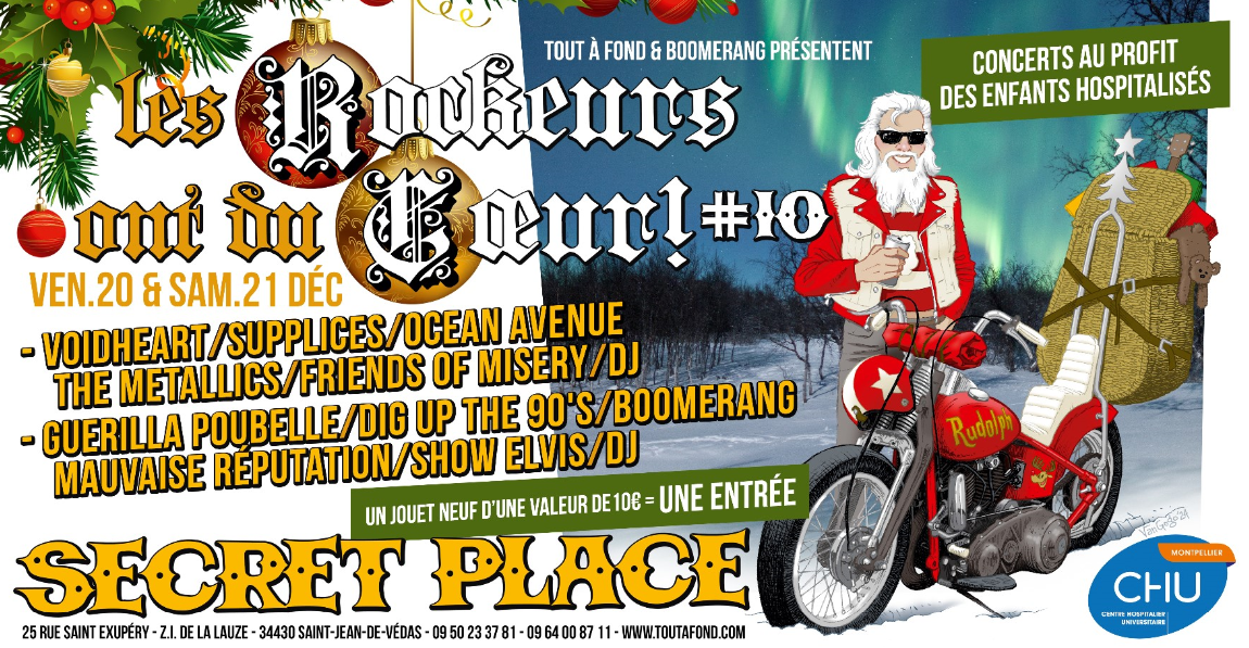 L'association TAF organise à la Secret Place de Saint Jean de Védas "LES ROCKEURS ONT DU COEUR", 10e collecte de jouets destinés aux enfants hospitalisés du CHU de Montpellier. Cette année la collecte de ce concert caritatif se déroulera sur deux jours car la scène musicale montpelliéraine et nationale se mobilise avec une soirée Metal le 20 décembre et une soirée Rock le 21 décembre. Et l'équipe de la Secret Place, ses bénévoles, les 10 groupes, les 2 DJs et le dessinateur espèrent réussir à réaliser la plus belle collecte de jouets pour cette 10e édition.