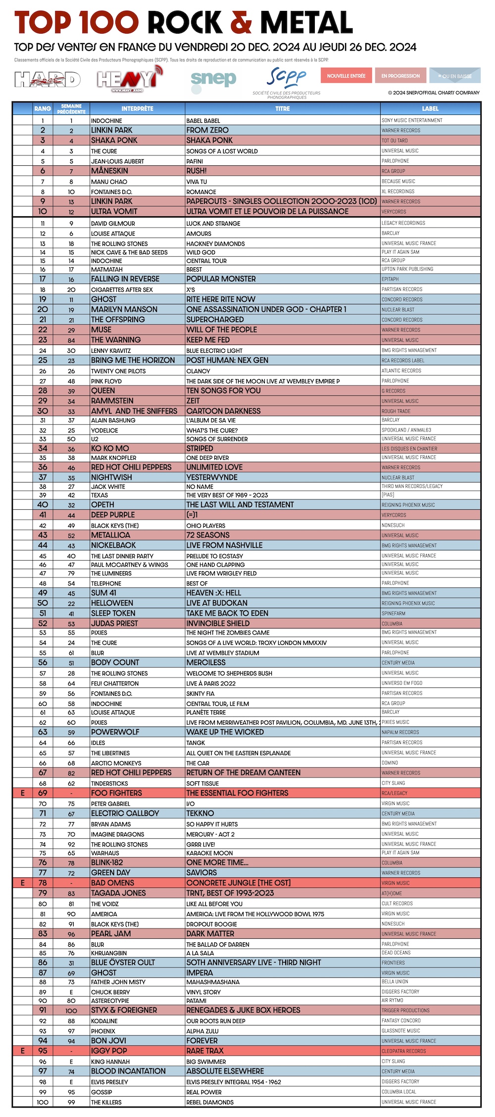 En partenariat avec le SNEP et la SCPP, ainsi que nos confrères ROLLING STONE et ROCK HARD FRANCE, HARD FORCE et HEAVY1 vous proposent le TOP 100 ROCK & METAL.