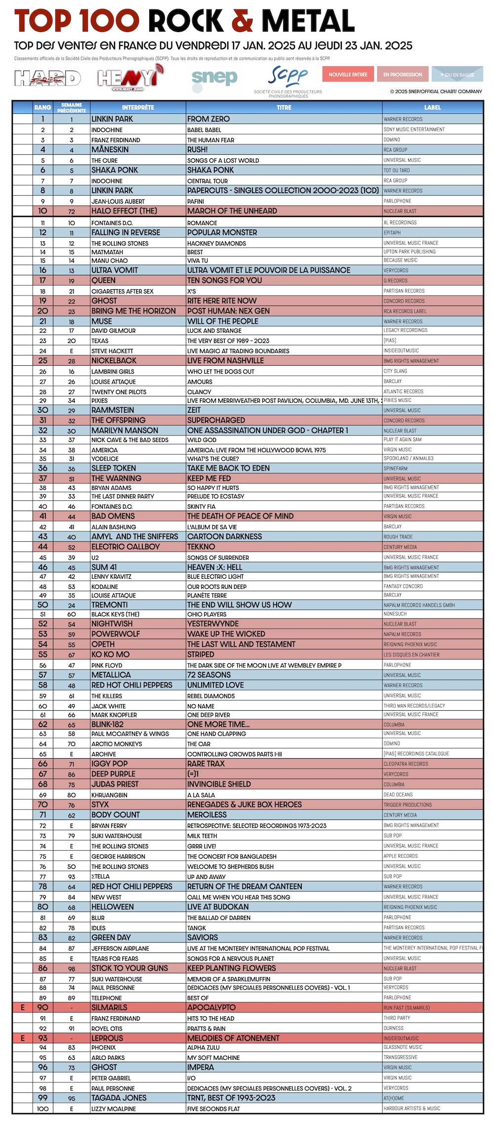 En partenariat avec le SNEP et la SCPP, ainsi que nos confrères ROLLING STONE et ROCK HARD FRANCE, HARD FORCE et HEAVY1 vous proposent le TOP 100 ROCK & METAL.