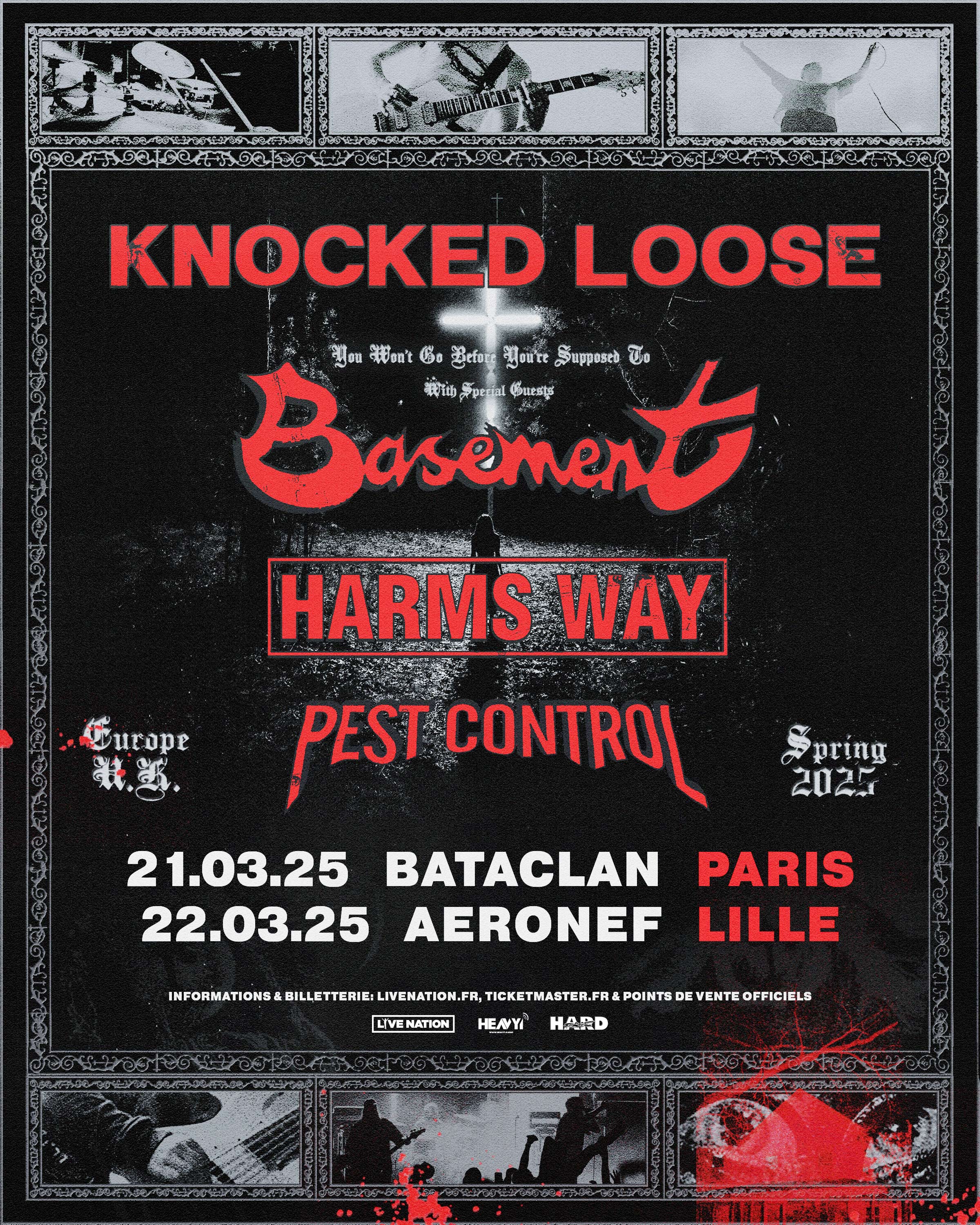 En mars, KNOCKED LOOSE entamera sa plus grande tournée en tête d'affiche en Europe et au Royaume-Uni à ce jour, qui les mènera dans dix villes au total, dont la célèbre O2 Brixton Academy de Londres. Les groupes BASEMENT, HARM'S WAY et PEST CONTROL assureront la première partie de ces concerts dont deux en France, pour rappel : le 21 mars à Paris (Bataclan) et le 22 mars à Lille (Aéronef). Billetterie disponible sur Livenation.fr/knocked-loose - Toutes les dates du groupe son à consulter sur son site officiel : KnockedLoose.com