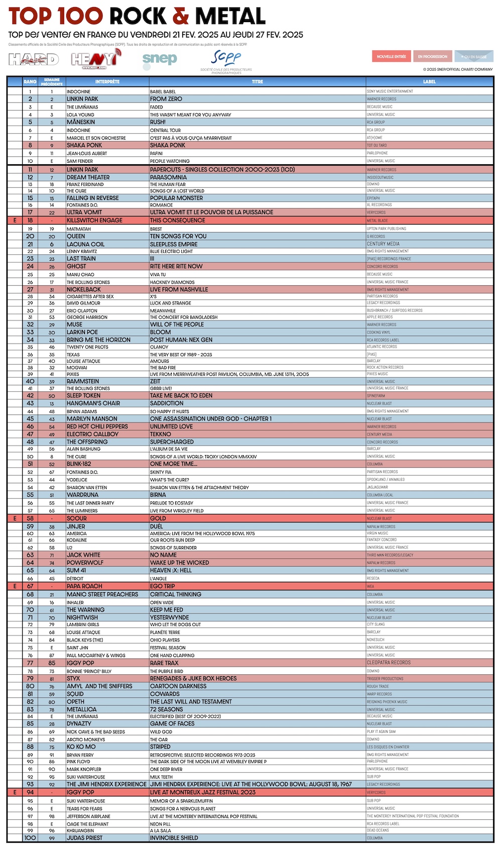 En partenariat avec le SNEP et la SCPP, ainsi que nos confrères ROLLING STONE et ROCK HARD FRANCE, HARD FORCE et HEAVY1 vous proposent le TOP 100 ROCK & METAL.