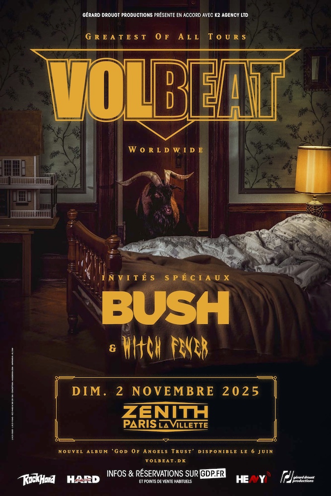 VOLBEAT, avec Michael Poulsen au chant et à la guitare, Jon Larsen à la batterie et Kaspar Boye Larsen à la basse, vient d'annoncer son 9e album « God Of Angels Trust » qui sortira le 6 juin sur son label depuis plusieurs années Vertigo/Universal. Vous pouvez déjà le précommander à cet endroit : Volbeat.GOAT