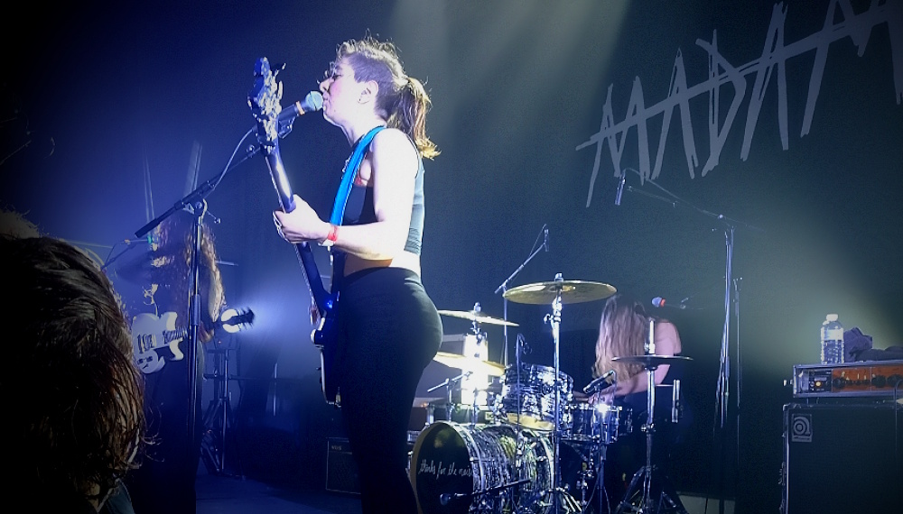 Complètement emballé par l’énergie de FULL THROTTLE BABY, le public attend avec impatience le set de MADAM. C’est avec une énergie redoutable que Gabbie Burns saisit sa guitare, Marine Masachs sa basse et qu’Anaïs Belmonte s’installe derrière sa batterie à paillettes. Après une intro tout en douceur (non), le groupe commence avec "Broken City" et la voix de Gabbie Burns, éraillée juste ce qu’il faut, résonne au-dessus du public. La magie opère à coup d’ostinatos de basse entraînants, de caisses et de cymbales de batterie puissants, d’une guitare dont les mélodies électrisent la salle jusqu’à la plonger dans une exaltante ambiance de rock garage propice aux déhanchements et pogos sur les paroles plus que galvanisantes des titres joués ce soir. Tous les disques y passent, le set mêlant les premiers EPs à l’album dont le groupe fêtera le premier anniversaire le 12 avril prochain au Ferrailleur de Nantes.