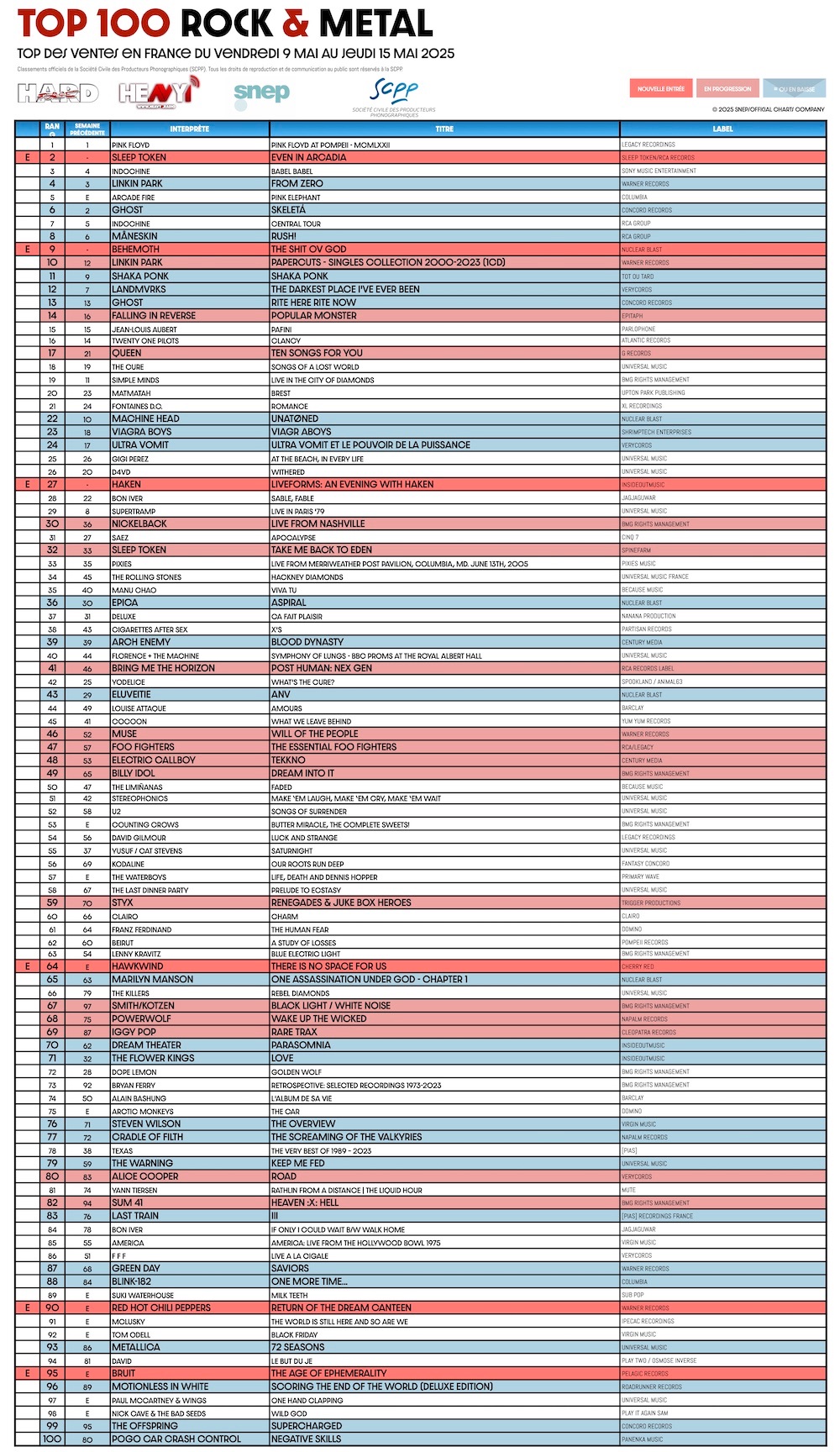 En partenariat avec le SNEP et la SCPP, ainsi que nos confrères ROLLING STONE et ROCK HARD FRANCE, HARD FORCE et HEAVY1 vous proposent le TOP 100 ROCK & METAL.