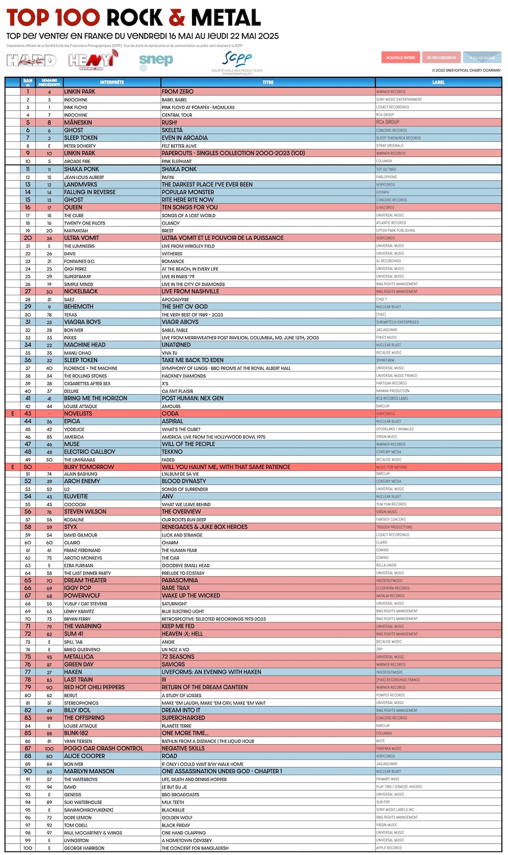 En partenariat avec le SNEP et la SCPP, ainsi que nos confrères ROLLING STONE et ROCK HARD FRANCE, HARD FORCE et HEAVY1 vous proposent le TOP 100 ROCK & METAL.