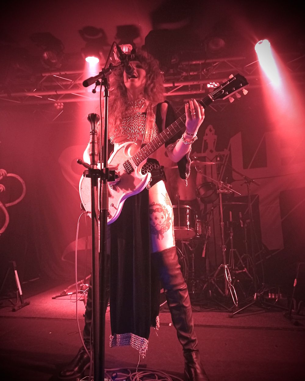 Afin de ménager un moment de calme entre deux coups de faux, le groupe entonne ‘Cry For Me’. Les lumières cessent de s’agiter et la Reine des Rats chante, accompagnée des deux guitares, quelques vibratos dans la voix pour la chanson la plus douce du groupe. Arrive ensuite un nouveau morceau dans lequel le Druide assure un solo de batterie pendant lequel il semble s’animer d’une énergie démoniaque. Le public accueille ce morceau (comme tous les autres) avec joie et enthousiasme. Nouvel interlude musical avant que le cri de la frontwoman au début de ‘Fresh Fur’ ne résonne dans la Boule Noire. Les riffs sont plus lourds, le calme n’était là que pour annoncer la tempête à venir. Alors que le Druide fait résonner les caisses et les cymbales de sa batterie, les guitaristes et le bassiste jouent à l’unisson ou assurent les mélodies qui accompagnent le chant réverbéré de la Reine des Rats. Les riffs sont bons, chaque musicien a droit à quelques moments de mise en lumière, montrant que le groupe fonctionne comme une bande d’ami.e.s basée sur la solidarité et l’admiration mutuelle. Se déroule ensuite un nouveau chapitre de l’histoire : le Rat Faucheur s’approche de la Reine des Rats qui s’empare de son épée. Le combat à mort voit le Rat vainqueur quitter la scène en laissant la Reine au sol, morte. Heureusement, dans chaque jeu de rôle plein de rebondissements, le Maître du Jeu prévoit des solutions. Le Docteur de la Peste sort alors une fiole de sa poche et la fait boire à la Reine. Miracle ! Elle revient à la vie ! La potion a un effet quelque peu radical et la fait courir de gauche à droite sur scène, elle sautille et sursaute, puis régurgite une partie de la potion sur le bord de la scène avant de se redresser et de reprendre sa guitare pour les deux derniers morceaux du set. Encore une belle surprise : ce sont deux nouveaux morceaux qu’offre le groupe au public de la Boule Noire. Tout aussi bien accueillis que les morceaux précédents, ceux-ci laissent présager un deuxième album prochainement. Un dernier combat entre la Reine des Rats et le Rat Faucheur et le public quitte la scène sous les applaudissements et les cris de joie du public.