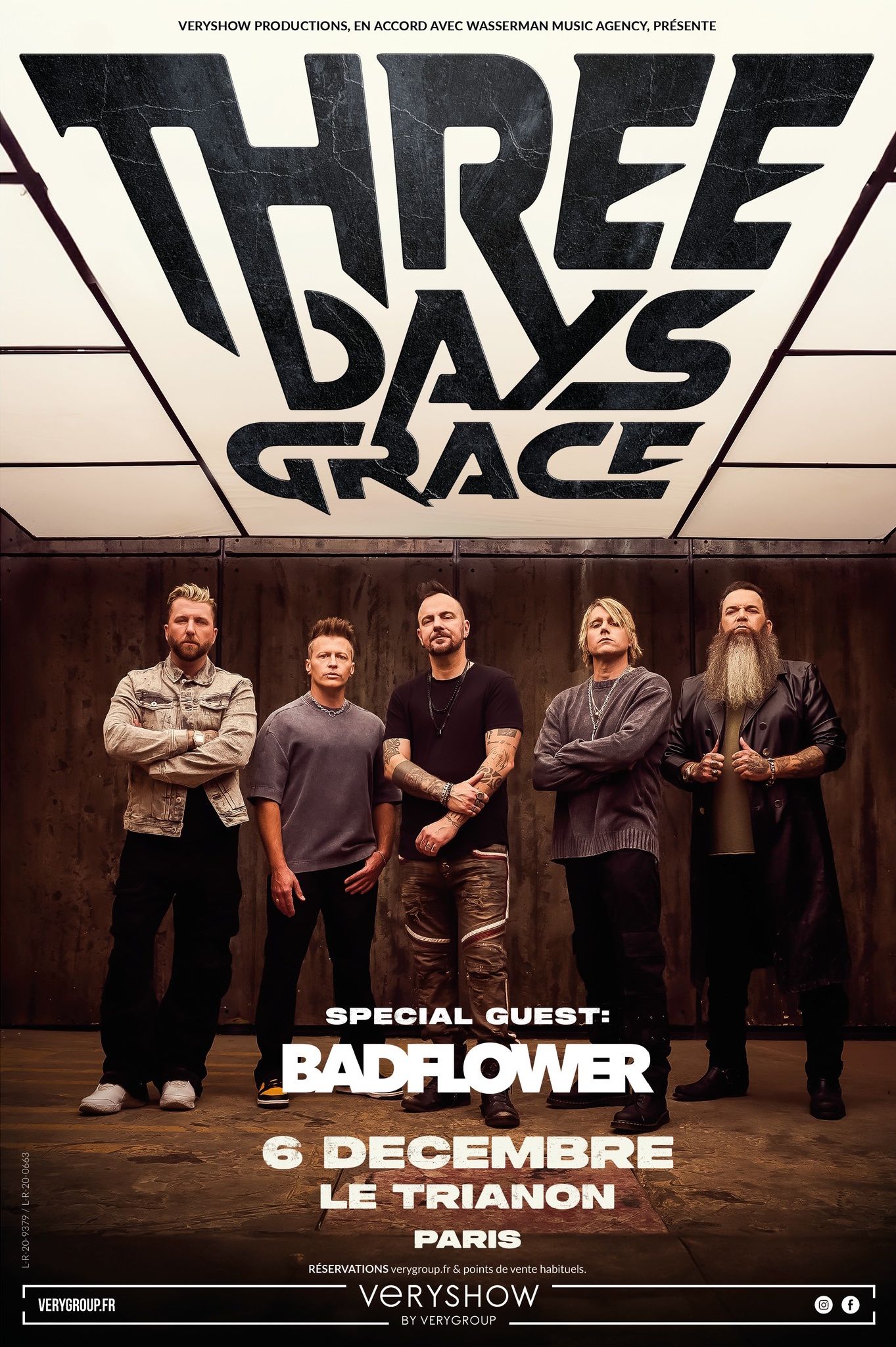 Après une tournée aux Etats-Unis jusqu'en octobre, THREE DAYS GRACE rejoindra l'Europe et le Royaume-Uni à partir du mois de novembre avec un passage à Paris le 6 décembre au Trianon avec BADFLOWER. La billetterie est à retrouver ici : Three-Days-Grace-Paris