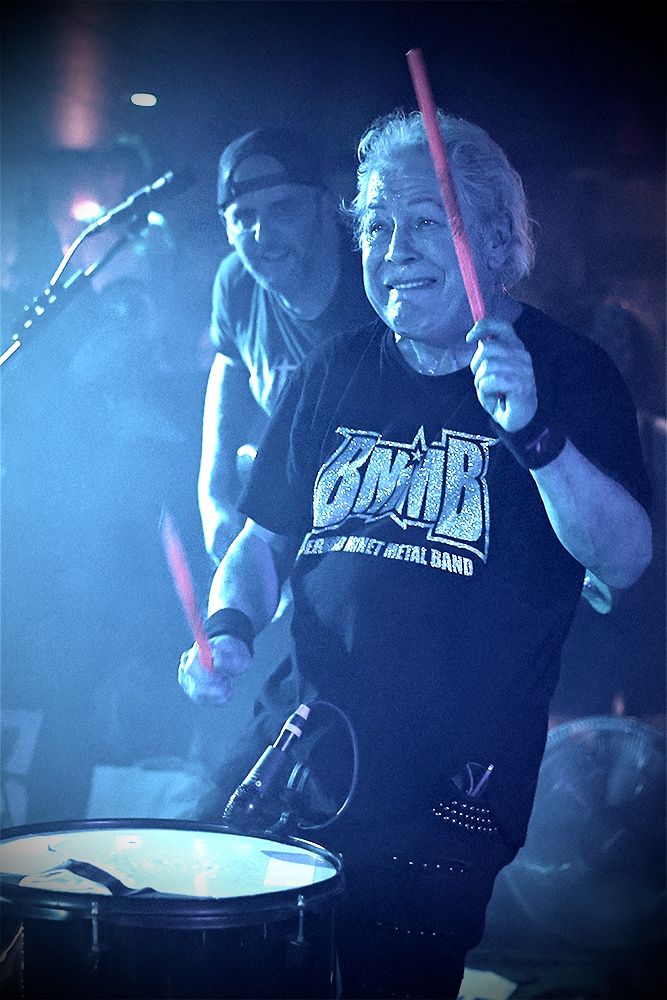 Ceux qui l’ont poussée pour découvrir le BERNARD MINET METAL BAND en live n’ont pas été déçus. Et ils étaient nombreux ! La salle était effectivement pleine à craquer pour voir Bernard entamer le show par "Goldorak Go !", pour kiffer le riff bien sympa de "Nicky Larson" pondu par Guillaume, pour s’étonner de la version très metal de "Olive et Tom" comme du délire carrément punkoïde que constituait "La Merguez Partie" ! Greg y assurant à la perfection les fameux "la la laï ouh, la la laï ouh ouuh ouuuh"… Ce fût ensuite au tour de Manard de prendre le micro, celui de Matthieu Bausson de s’emparer de la basse pour accompagner Bernard Minet le temps d’un "Keken" survitaminé. Les musiciens se sont éclatés… et ça se voyait : sourire pendu aux lèvres pour Guillaume, regard enjoué pour Bryan, tandis que Greg était clairement le plus expansif ! Tu m’étonnes : jouer avec son idole Bernard Minet le soir de son annif’, chez lui, à L’Oliver, devant un public aussi enthousiaste… je n’ose imaginer ce qu’il s’est passé en troisième mi-temps !