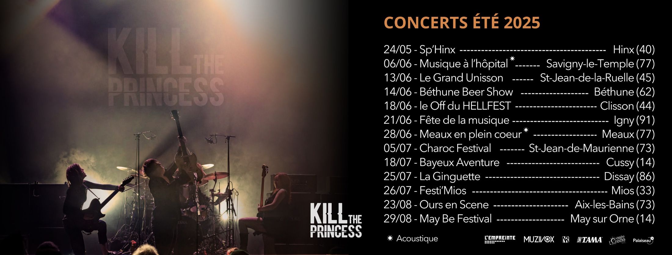 Soutenues par la SMAC L’Empreinte de Savigny-le-Temple, signées chez Muzivox, pour ce qui concerne les concerts et tournées, et impliquées dans leur label associatif Music Maze, elles tracent leur chemin en toute indépendance. Mais KILL THE PRINCESS, c’est aussi un manifeste. Féminisme, queer pride, lutte contre les violences sexistes et sexuelles, déconstruction des stéréotypes de genre, leur musique est une arme et un refuge. Elles participent à des événements culturels pour la place des femmes dans la musique et leurs textes incarnent une urgence politique autant qu’une quête de résilience.