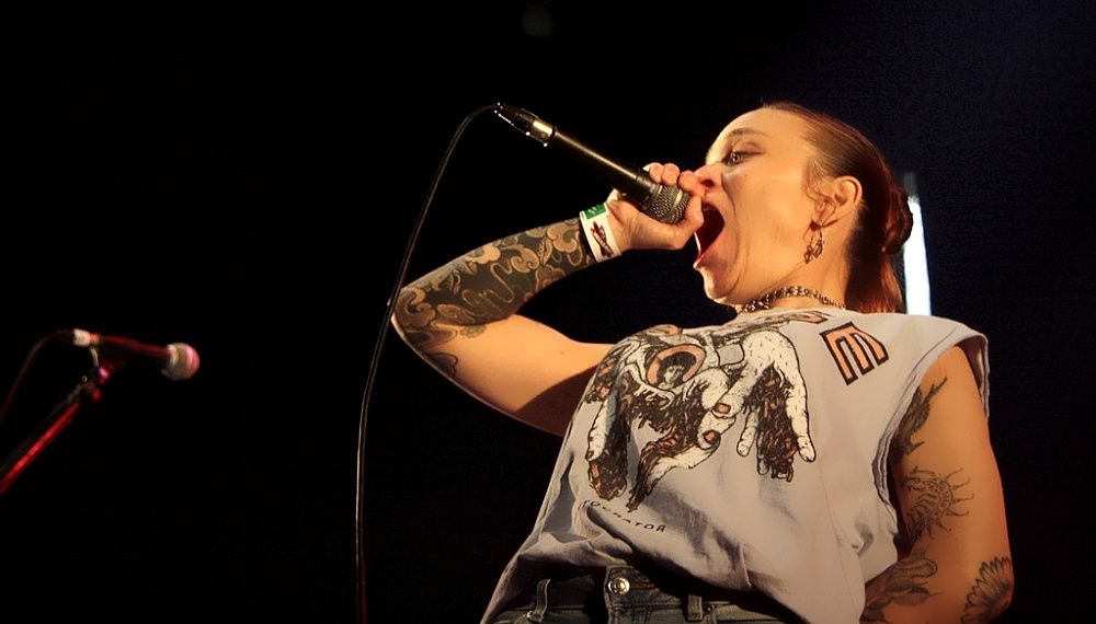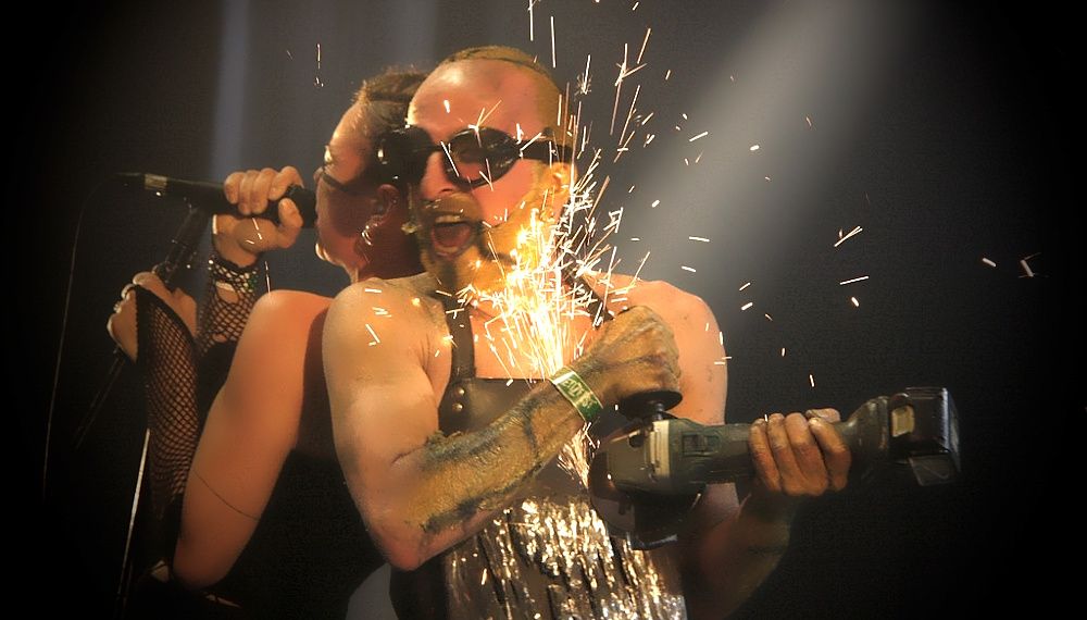 Ce vendredi soir voit alterner formations qui misent tout sur la musique et d’autres qui préfèrent offrir un spectacle total. Tel est la cas des inclassables KRAV BOCA dont les 50 minutes nagent entre concert et performance, entre spectacle grand-guignol et ambiances malsaines. Leur mélange de rap, de metal et de punk, au son rendu encore plus étrange par la présence d’une mandoline, explose en cris de rage assénés par les deux chanteurs masqués qui galopent sur les planches, animaux en folie, sans laisse, à deux doigts de l’asphyxie tant ils ne cessent de courir. La chanteuse n’est pas en reste et, le micro posé, devient la comparse de l’homme de feu, énergumène qui joue avec les flammes, qui fait crisser en gerbes d’étincelles une disqueuse sur son corps métallisé avant de se rouler par terre et de s’arracher son costume d’or comme s’il se déchirait la peau, la bave aux lèvres. Les deux larrons se retrouvent même dans une bulle de gaze, chrysalide dont ils s’extirpent en une sorte d’accouchement dégénéré. Des fumigènes crépitent dans la salle qui devient un enfer rougeoyant où les silhouettes des pogoteurs dessinent un sabbat écarlate. A la mode grecque et à l’appel du groupe sur le bien nommé "Canette", les spectateurs, après avoir hurlé « Antifascisti » à pleins poumons, lancent leur gobelet sur scène. Et c’est parti pour des allers-retours incessants de verres en plastique... Le chaos est total pour cette fête sexy et dérangée... et tant pis si la mise en place n’est guère carrée, si le son est parfois brouillon : l’essentiel est dans la folie, dans le déchaînement d'essence, des sens.
