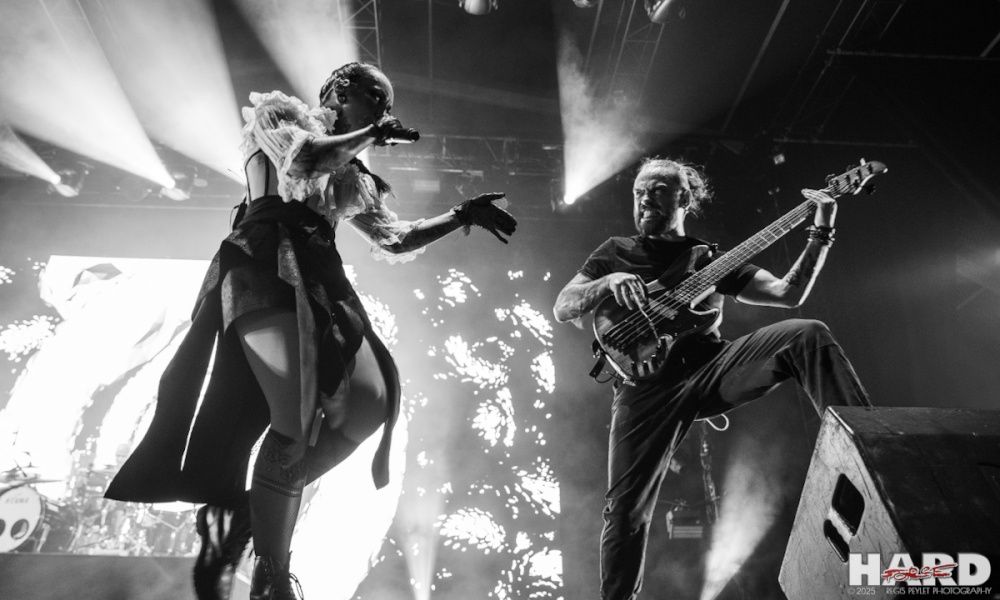 Il est presque 22h, toujours sous l’Altar maintenant comble, quand débute le set des Ukrainiens JINJER. Tout le monde n’a visiblement pas pu venir se masser sous le auvent, à en juger les messages de mes amis qui se sont laissés surprendre par l’affluence et qui devront se contenter des écrans extérieurs, voire juste d’un son lointain. Alors que le logo de JINJER s’estompe et que les lumières baissent, la clameur des fans retentit et les musiciens font leur entrée seuls, sans la frontwoman, et "On The Top" commence. Je constate que des images sont diffusées sur l’écran derrière le groupe, dans une belle synchronisation avec le rythme du morceau, et c’est alors que Tatiana Shmayluk entre enfin sur scène, avec un chemisier blanc, un corset, une jupe asymétrique et des gants en dentelle. La patronne vient aux affaires ! Elle nous gratifie d’un « bonsoir » et demande à entendre nos voix. Nous tapons des mains sur le passage calme de la chanson (de courte durée), alors que je me fais la réflexion que la caisse claire a toujours ce son sec si reconnaissable.