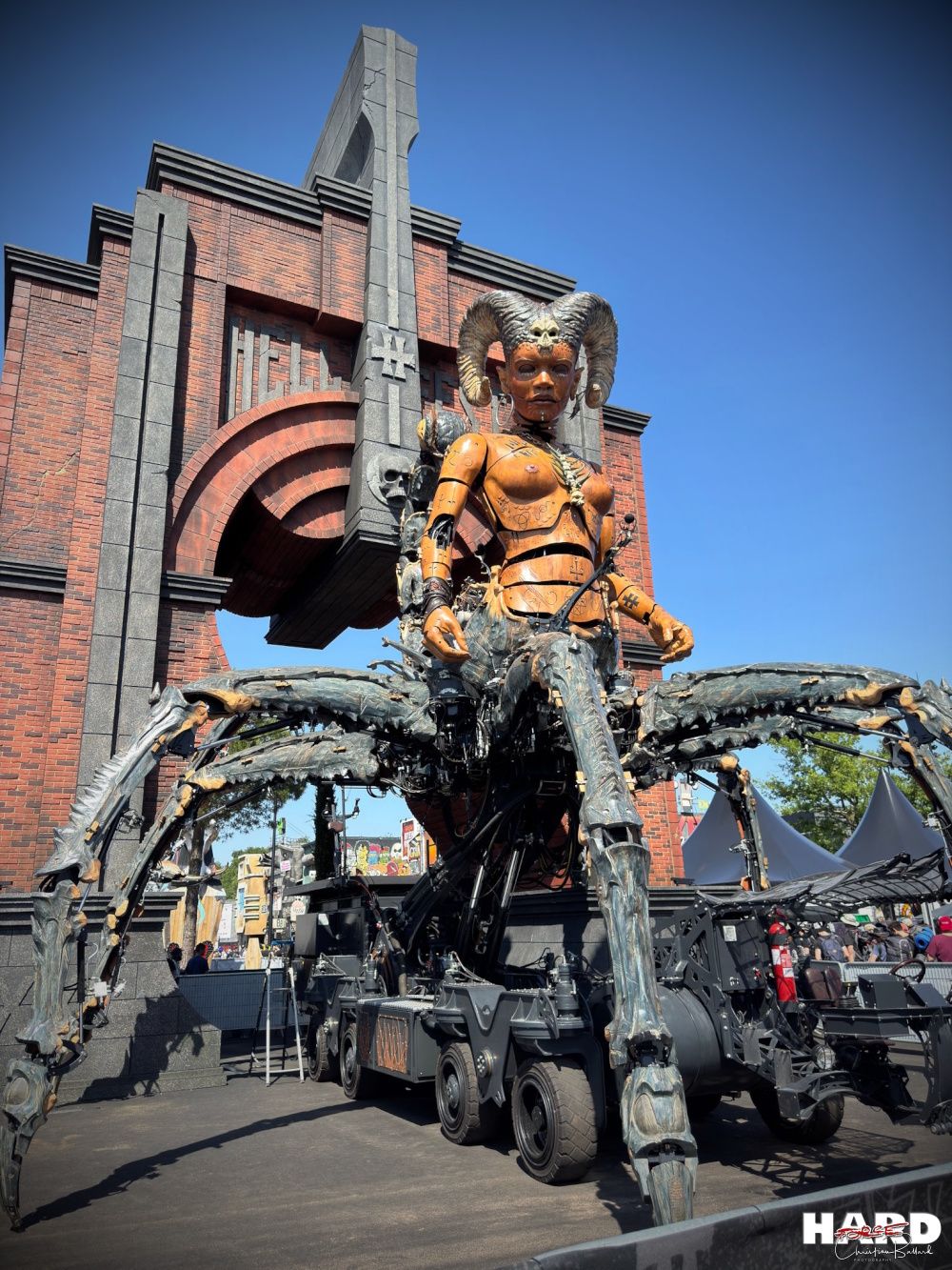 Même si les portes de la cathédrale n’ouvriront que demain pour les concerts du festival, le Hellfest a prévu un comité d’accueil efficace pour les headbangers qui, comme moi, sont arrivés plus tôt. Dès ce mercredi, j’ai pu faire un tour au Hellcity Square, pour un peu de shopping sur les stands de l'Extreme Market, ou pour me restaurer au Metal Corner. J’ai été accueillie par la Gardienne des Ténèbres, qui a été révélée l’an dernier, postée ce soir devant une toute nouvelle arche d’entrée vers la Hellcity, les yeux fermés et la tête penchée vers le sol, comme endormie. C’est au Metal Corner que je découvre la nouvelle scène qui prend la place de la Fanzone : la Purple House, grande tente sombre surmontée d’une planète violette, qui accueille en son sein des jeux d’arcade, des stands d’animations avec des défis, mais surtout en son centre une scène circulaire piégée dans une cage, nous permettant de vivre un concert à 360 degrés. J’inaugure cette nouveauté avec le groupe JUMPING JACK, venu de Nantes pour nous proposer un stoner rock pêchu. Une fois un souci de sortie de son de guitare réglé, le trio nous présente un set très énergique et je vis ma première suée du week-end sous une tente à l’ambiance torride...