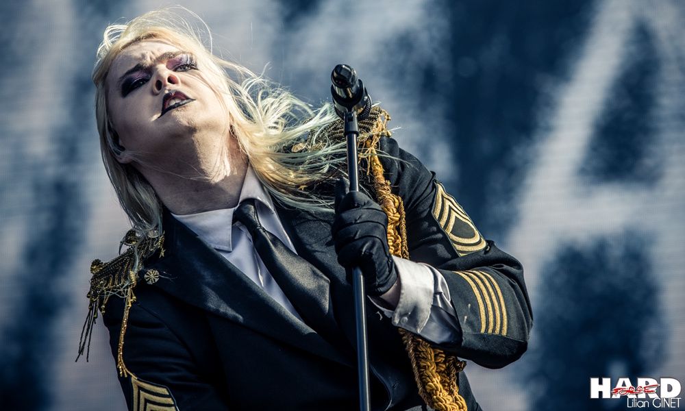 Alors qu’une bande son déclame une série de mots dans le registre des difficultés, de la résilience et de la reprise de pouvoir, je vois arriver sur scène Kim Dracula, vêtu d’un costume rappelant un commandant, cheveux blonds platine, maquillage appuyé jusqu’à un rouge à lèvres criard. Mais la surprise vient surtout du son ! "Land Of The Sun" démarre par des gros riffs de guitare agressifs, accompagnés par des blasts de batterie, au service d’une voix typée nu-metal, ce qui éteint instantanément tout début de questionnement sur la raison de la programmation de cet artiste à l’affiche du Hellfest.
