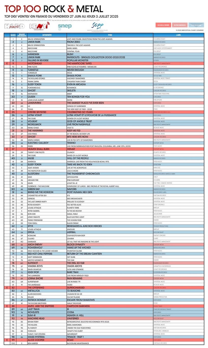 En partenariat avec le SNEP et la SCPP, ainsi que nos confrères ROLLING STONE et ROCK HARD FRANCE, HARD FORCE et HEAVY1 vous proposent le TOP 100 ROCK & METAL.