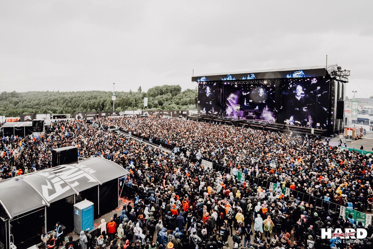 En pénétrant sur le Nürburgring, on sent immédiatement qu’on n’est pas dans un festival rock ordinaire. Le vaste tracé bitumé, flanqué de tribunes rutilantes et de pylônes illuminés, évoque un paysage presque post-apocalyptique sous l’air froid de juin. Devant la scène principale s’étire un immense couloir de foule – une étendue rectangulaire d’asphalte noire, compacte, où les fans se pressent à perte de vue. Température : autour de 10°C, avec des averses fréquentes qui poussent les festivaliers à enfiler ponchos et parkas. Pour assurer la sécurité des 90 000 participants (et préserver le site), les organisateurs ont renforcé les mesures de sécurité et les protocoles de durabilité – barrières, règles strictes de circulation. Au Rock am Ring, l’expérience repose sur l’engagement, l’énergie et le rituel partagé du volume à haute dose. Ce n’est pas un petit festival estival cosy, mais une épreuve pour les fidèles – un marathon dans le froid, la fatigue et les décibels. Des fidèles venus pour se fondre dans une musique ininterrompue et cette affiche titanesque.