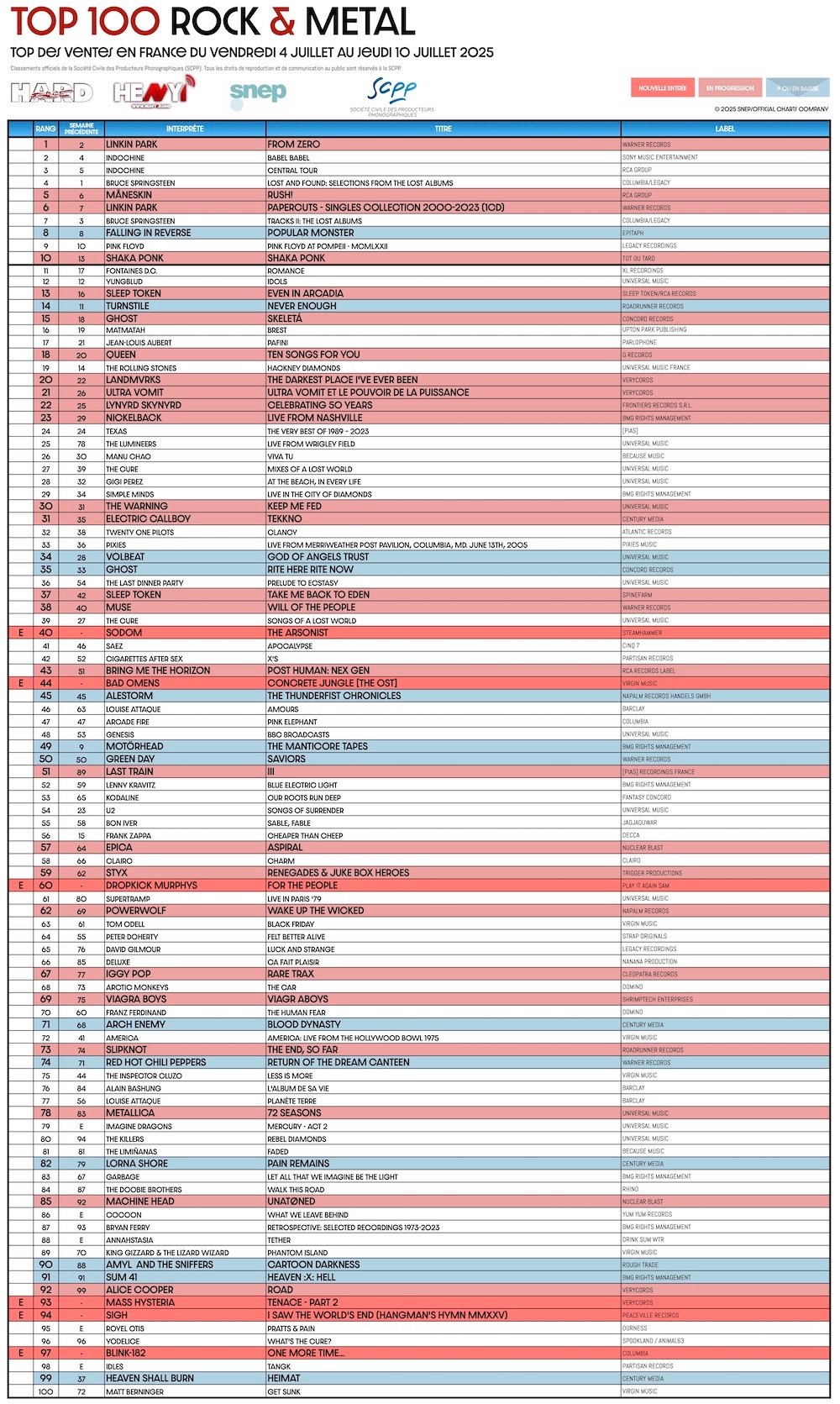 En partenariat avec le SNEP et la SCPP, ainsi que nos confrères ROLLING STONE et ROCK HARD FRANCE, HARD FORCE et HEAVY1 vous proposent le TOP 100 ROCK & METAL.