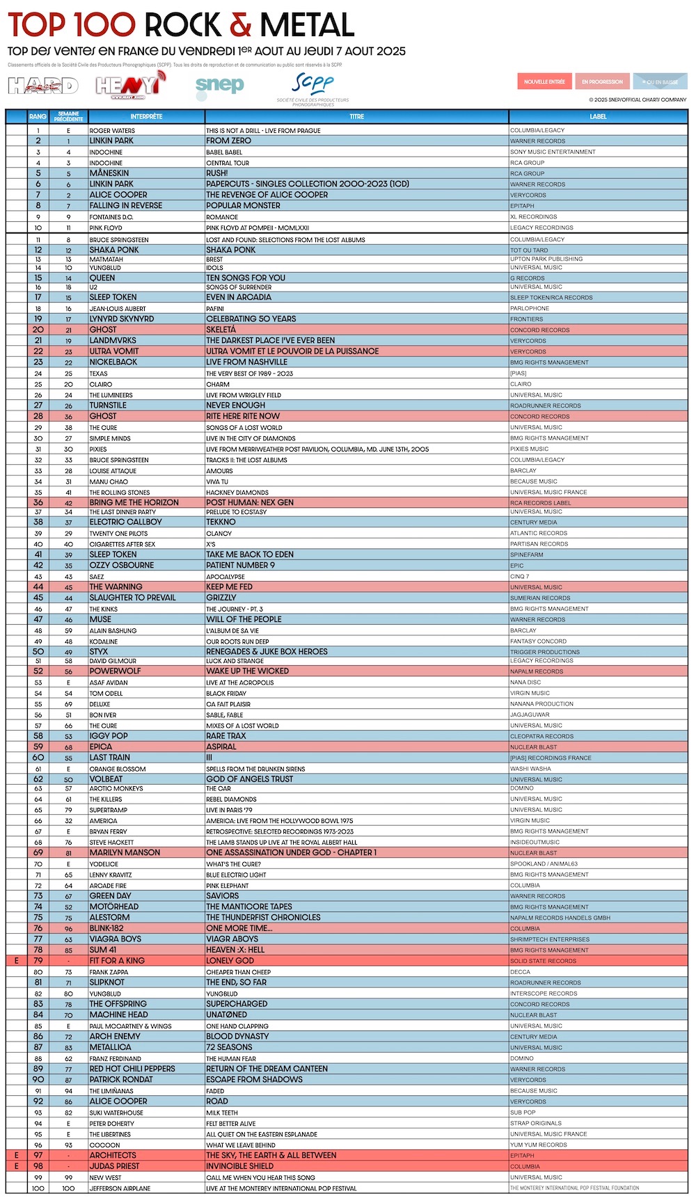 En partenariat avec le SNEP et la SCPP, ainsi que nos confrères ROLLING STONE et ROCK HARD FRANCE, HARD FORCE et HEAVY1 vous proposent le TOP 100 ROCK & METAL.