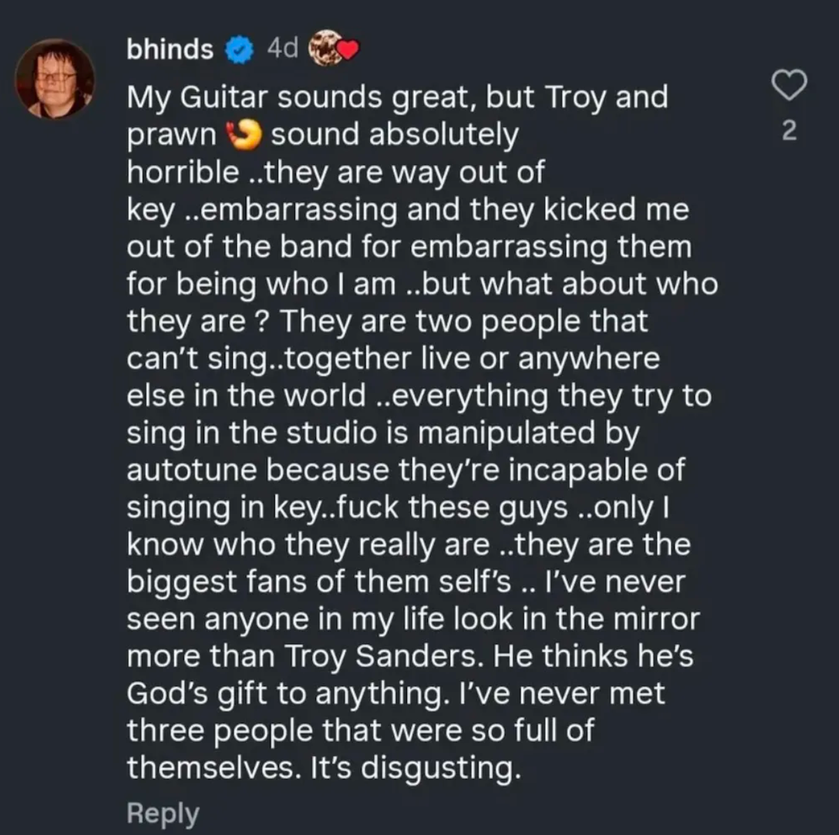 « Ma guitare sonne super bien, a-t-il commenté sur son compte, mais Troy [Sanders, le bassiste/chanteur] et Prawn [c'est apparemment le surnom que donne Hinds à Brann Dailor, le batteur/chanteur, “prawn” signifiant “crevette”] sonnent affreusement mal… Ils sont complètement faux… C'en est gênant et ils m'ont viré du groupe pour les avoir humiliés à cause de ce que je suis… mais ils se sont regardés ? Ils sont incapables de chanter ensemble… ni en concert, ni ailleurs… Tout ce qu'ils essaient de chanter en studio est retouché à l'autotune parce qu'ils sont incapables de chanter juste… Qu'ils aillent se faire foutre… Je suis le seul à savoir qui ils sont vraiment… Ce sont les plus grands fans d'eux-mêmes... Je n'ai jamais vu personne se mater autant dans le miroir que Troy Sanders. Il se prend pour un don du ciel. Je n'ai jamais rencontré trois personnes aussi imbues d'elles-mêmes. C'est à gerber. »