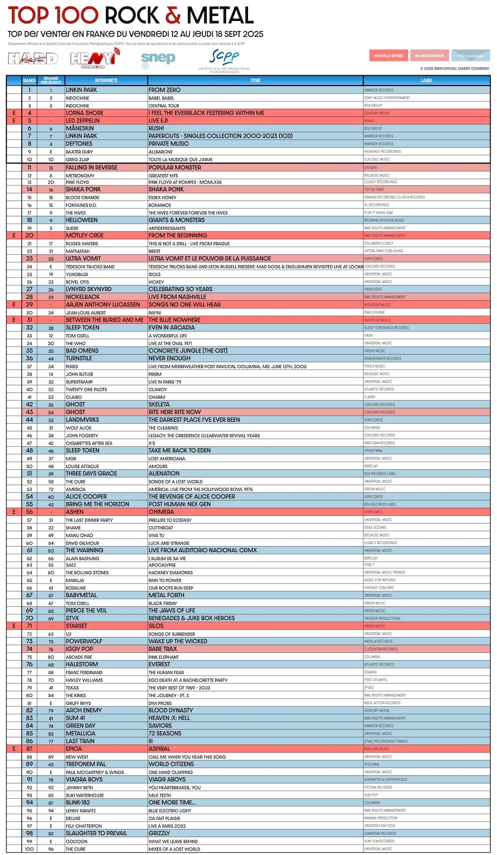 En partenariat avec le SNEP et la SCPP, ainsi que notre confrère ROLLING STONE, HARD FORCE et HEAVY1 vous proposent le TOP 100 ROCK & METAL.