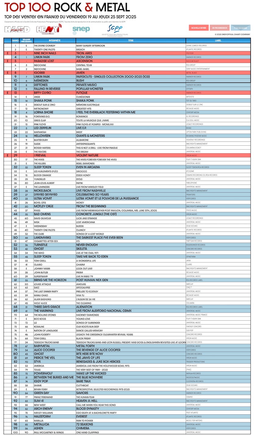 En partenariat avec le SNEP et la SCPP, ainsi que notre confrère ROLLING STONE, HARD FORCE et HEAVY1 vous proposent le TOP 100 ROCK & METAL.