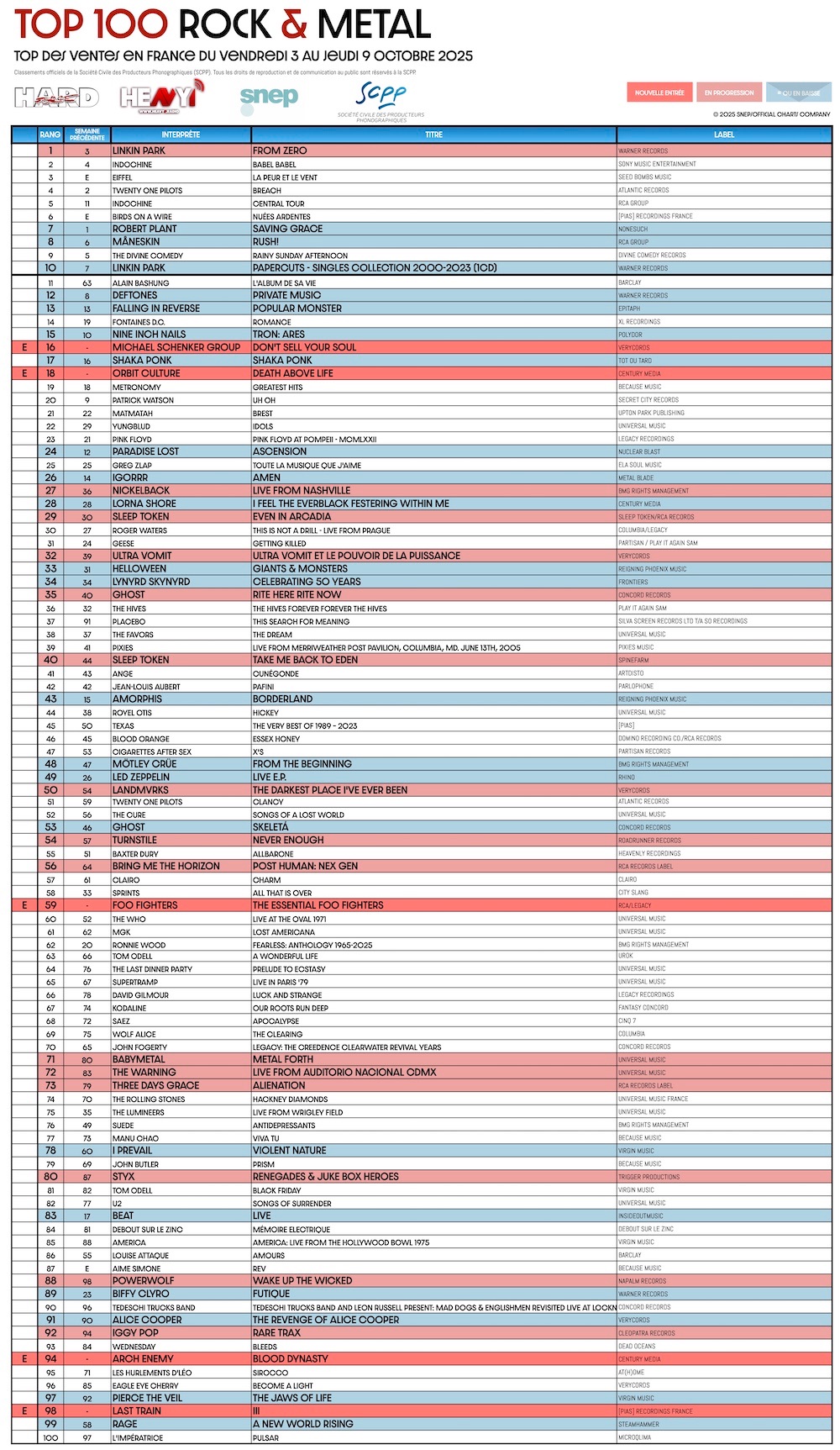 En partenariat avec le SNEP et la SCPP, ainsi que notre confrère ROLLING STONE, HARD FORCE et HEAVY1 vous proposent le TOP 100 ROCK & METAL.