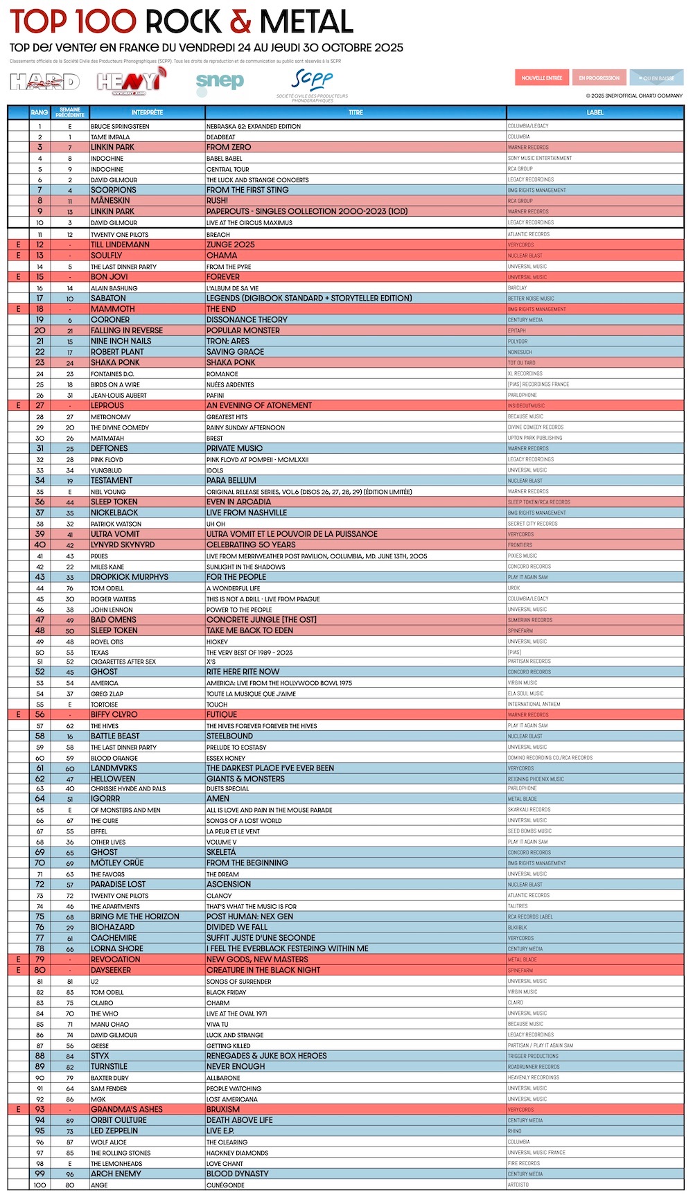 En partenariat avec le SNEP et la SCPP, ainsi que notre confrère ROLLING STONE, HARD FORCE et HEAVY1 vous proposent le TOP 100 ROCK & METAL.