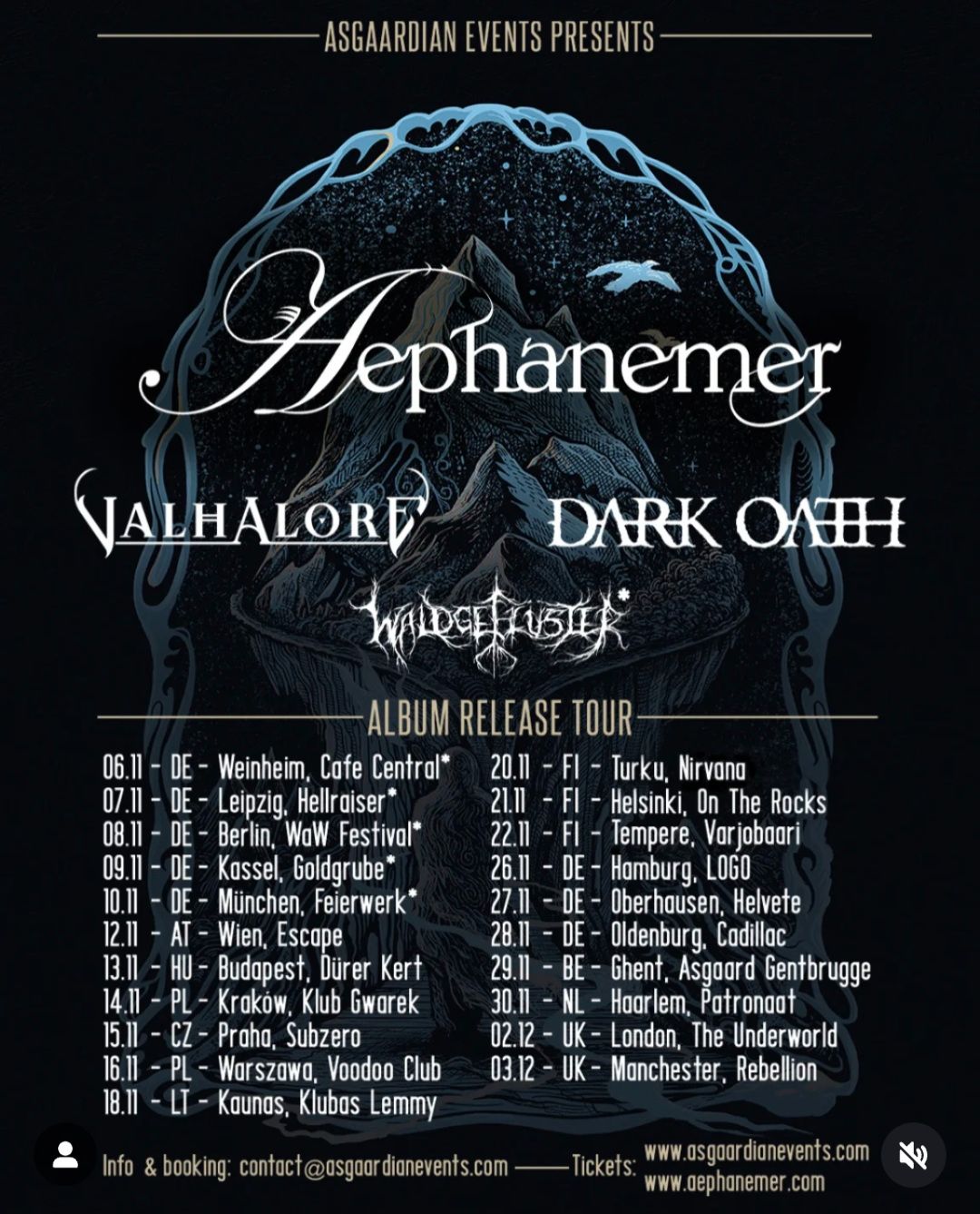 Pour promouvoir ce nouvel album, le groupe se lancera dans une tournée européenne début novembre, avec comme invités spéciaux VALHALORE, DARK OATH et WALDGEFLÜSTER. Retrouvez toutes les dates de concerts sur l'affiche sous la vidéo !