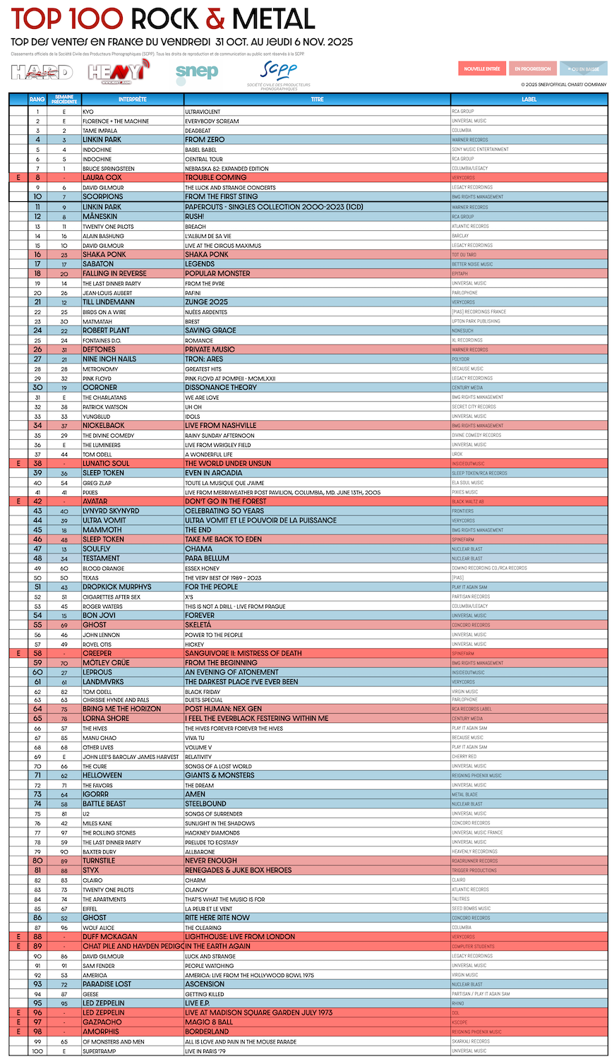 En partenariat avec le SNEP et la SCPP, ainsi que notre confrère ROLLING STONE, HARD FORCE et HEAVY1 vous proposent le TOP 100 ROCK & METAL.