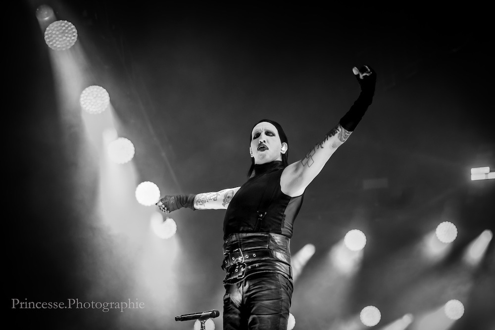 Sur scène, Manson s’appuie sur une machine de guerre : Tyler Bates et ses guitares / claviers cinématographiques, Reba Meyers, la guitariste ultra charismatique qui capte tous les regards, Piggy D., le vétéran de Rob Zombie, et Gil Sharone, batteur technique et nerveux. Chacun apporte sa touche, et ensemble, ils font que la set-list qui suit frappe fort et ne perd jamais en intensité : voir la set-list