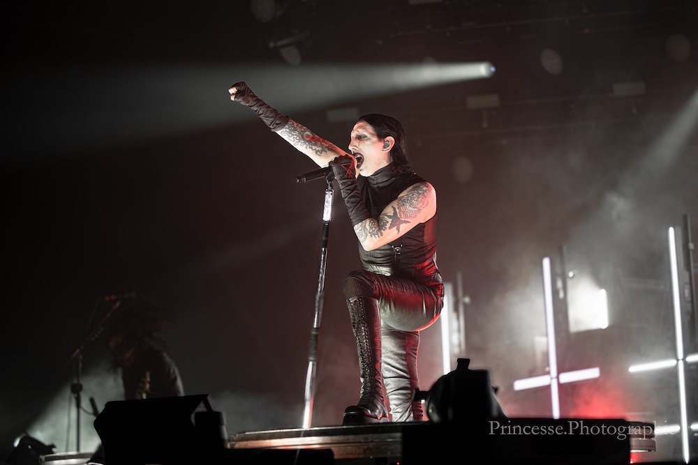 La mise en scène, volontairement épurée, amplifie cet effet : pas de grands apparats ni de pyro, pas de gigantisme sauf lors de son arrivée sur ses mythiques échasses pour "Tourniquet", juste un espace lumineux, souvent dans les tonalités rouges, où l’artiste expose son ombre et sa voix. Et ça fonctionne. Manson règne dans le vide, et ce vide-là lui va bien.