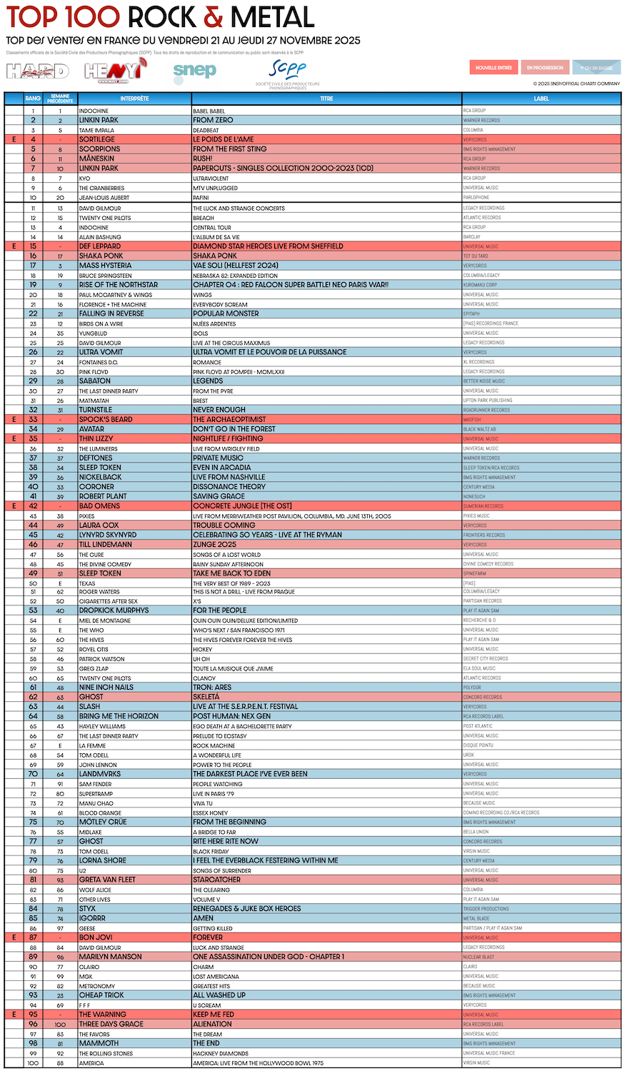 En partenariat avec le SNEP et la SCPP, ainsi que notre confrère ROLLING STONE, HARD FORCE et HEAVY1 vous proposent le TOP 100 ROCK & METAL.