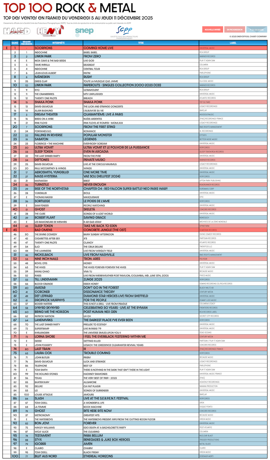 En partenariat avec le SNEP et la SCPP, ainsi que notre confrère ROLLING STONE, HARD FORCE et HEAVY1 vous proposent le TOP 100 ROCK & METAL.