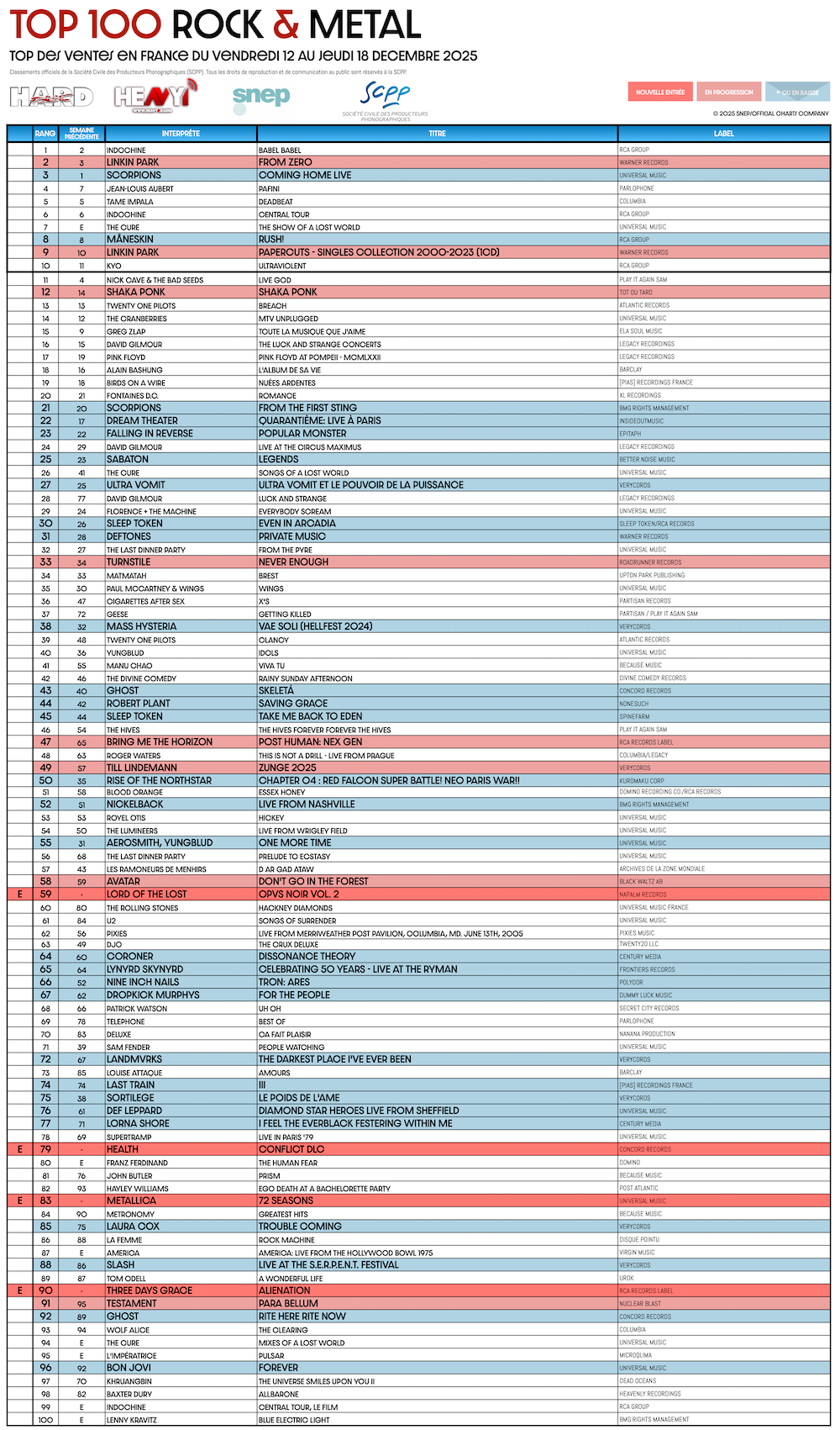 En partenariat avec le SNEP et la SCPP, ainsi que notre confrère ROLLING STONE, HARD FORCE et HEAVY1 vous proposent le TOP 100 ROCK & METAL.