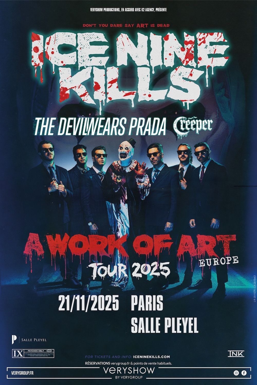 Quoi de mieux qu’un vendredi soir de novembre pour plonger dans une ambiance horrifique ? Ça tombe bien : le vendredi 21 novembre, ICE NINE KILLS donnait un concert à la Salle Pleyel, accompagné de THE DEVIL WEARS PRADA et CREEPER, dans le cadre du "Work Of Art Tour". Un événement affichant complet, qui laissait présager une soirée mémorable. Avant d’entrer dans le vif du sujet, rappelons que ICE NINE KILLS sera de retour en France cet été avec un passage très attendu au Heavy Week-End de Nancy le dimanche 7 juin 2026.