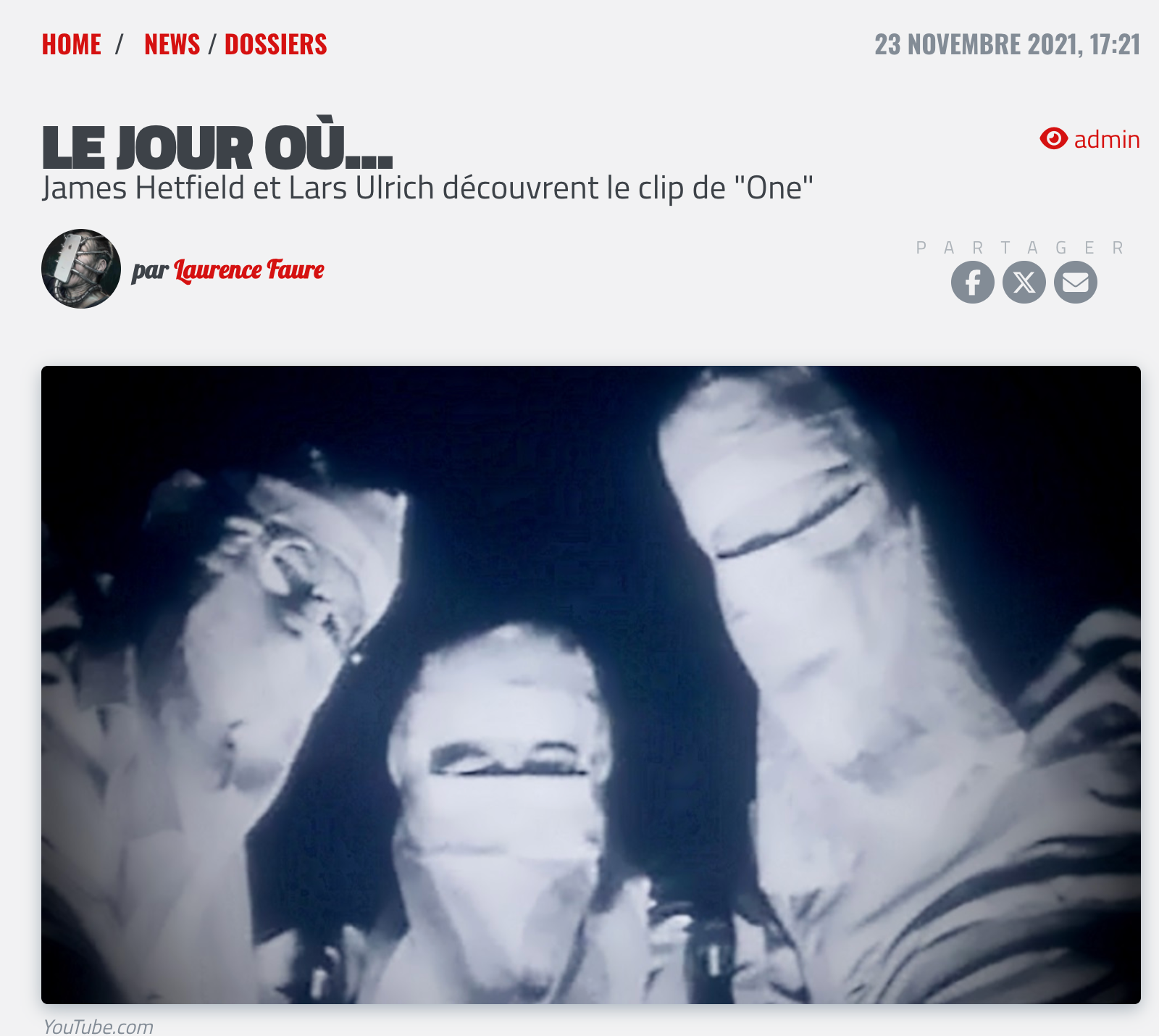 Le 20 janvier 1989, METALLICA sortait “One”, 2e et dernier single tiré de « … And Justice For All » (1988) et tout premier clip de sa carrière. L'occasion de regarder dans le rétro et de (re)découvrir la réaction de James et Lars le jour où ils ont visionné la vidéo pour la première fois…